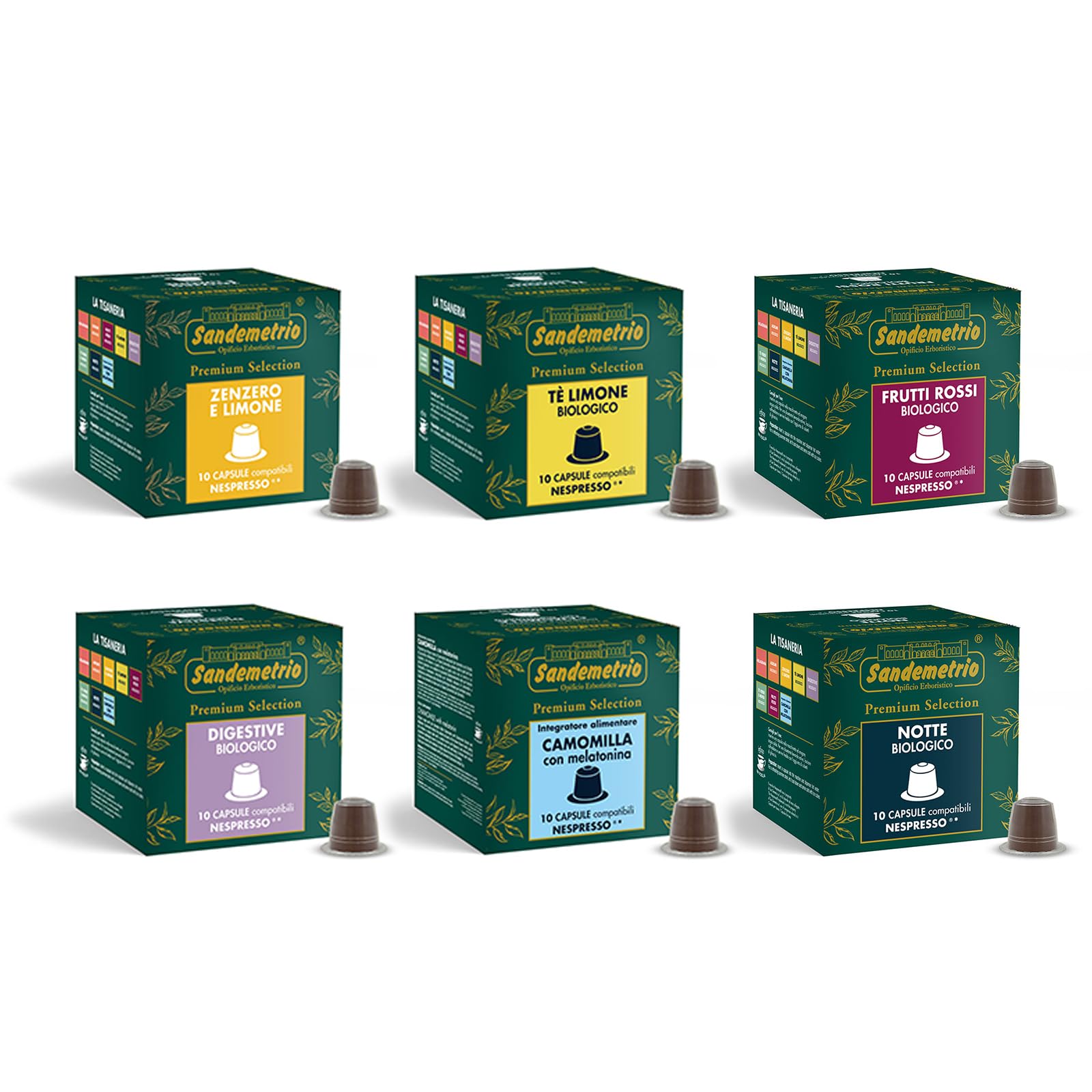 Emporio del Caffè has selected a blend of teas and herbal infusions from Sandemetrio for you, in boxes of 10 capsules, to be prepared with your Nespresso coffee machine. When purchg, you choose the products you wish to receive by adding a note to your order or sending us a message. If no selection is made, a blend will be sent based on current availability. You can choose from: Organic Lemon Black Tea: a tea blend with a strong and full-bodied flavor, accompanied by the pleasant taste of lemon, sugar-free and lactose-free. Ingredients: tea leaves natural lemon flavoring, from organic farming. Organic Cinnamon and Orange: a cinnamon-based blend with a pleasant orange flavor. Sugar-free, lactose-free, and caffeine-free. Ingredients: cinnamon and orange. Organic Digestive Herbal Tea: a blend of fennel and mint for an intensely aromatic and pleasant herbal tea. Especially recommended after meals, sugar-free, lactose-free, caffeine-free, and with no added flavorings. Ingredients: fennel fruit, peppermint leaves, organically grown. Organic Forest Fruits: a thirst-quenching fruity blend enriched with natural flavors. Rejuvenates the spirit in cold weather and quenches thirst on hot summer days, sugar-free and lactose-free. Ingredients: hibiscus flowers dog's rose fruit cinnamon bark, natural strawberry and raspberry flavors, apple, orange peel, elderberry fruit, clove, natural cinnamon flavor. Organically grown. Ginger and Lemon: a blend that combines the pleasant taste of lemon with the incomparable aroma of ginger, sugar-free, lactose-free, and caffeine-free. Ingredients: lemongrass leaves ginger root licorice root natural lemon flavors, peel. Organically grown. Buonnight Herbal Tea: an organic blend of passionflower and hawthorn, promoting peaceful and restful sleep. Ingredients: chamomile flowers, passionflower aerial parts, orange leavesSandemetrio Te et Tisanes Bio compatibles avec Nespresso, Choisissez parmi : vous au Citron, Tisane Nuit, Digestive, Cannelle et Orange, Gingembre et Citron, Baies. 50 Capsules (5 boîtes de 10 cps)DESCRIPTION DU PRODUIT L'Emporio del Caffè a sélectionné pour vous un mélange de thé et de tisanes de Sandemetrio, en boîtes de 10 capsules, à préparer avec votre machine à café Nespresso. Lors de l'achat, vous choisissez les produits à recevoir en insérant une note à la commande ou en nous envoyant un message, en cas de non-sélection, un mélange sera envoyé en fonction des disponibilités du moment. Vous pourrez choisir parmi : le noir au citron bio : mélange de thé au goût ferme et lourd, accompagné du goût agréable du citron, sans sucre et sans lactose. Ingrédients : thé, feuilles Arôme naturel de citron, issu de l'agriculture biologique. Cannelle et orange bio : mélange à base de cannelle, accompagné d'un agréable goût d'orange. Sans sucre, sans lactose et sans caféine. Ingrédients : cannelle et orange. Tisane digestive bio : mélange à base de fenouil et de menthe pour une tisane au parfum intense et agréable. Particulièrement indiquée après les repas, sans sucre, sans lactose, sans caféine et sans arômes ajoutés. Ingrédients : fenouil, fruits, menthe poivrée, feuilles, issu de l'agriculture biologique. Fruits de forêt bio : un mélange fruité désaltérant enrichi d'arômes naturels. Régénère l'esprit par temps froid et désaltère les chaudes journées d'été, sans sucre et sans lactose. Ingrédients : hibiscus, fleurs rose de chien, fruits cannelle, écorce, arômes naturels de fraise et framboise, pomme, orange, écorces, sureau, fruits, clou de girofle, arôme naturel de cannelle. Issu de l'agriculture biologique. Gingembre et citron : un mélange qui renferme le goût agréable du citron et l'arôme incomparable de gingembre, sans sucre, sans lactose et sans caféine. Ingrédients : citronnelle, feuilles gingembre, racine réglisse, racine arômes naturels de citron, écorces Issu de l'agriculture biologique. Tisana Buonnight : mélange biologique à base de Passiflore et d'aubépine, favorise un sommeil paisible et reposant. Ingrédients : camomille fleurs, passiflore partie aérienne, orange feuilles