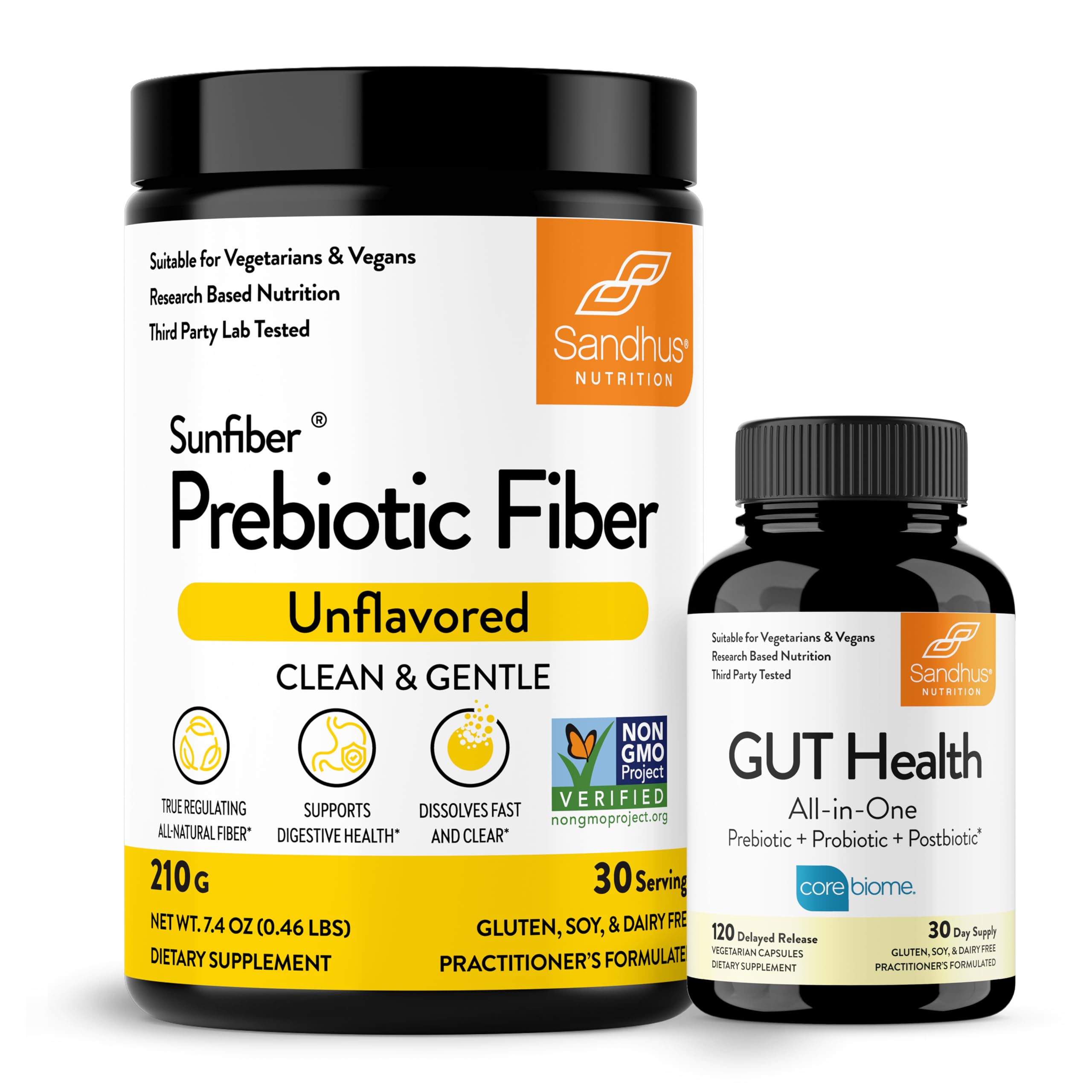 ChatGPT Introducing Sandhu's Digestive Health Solutions, meticulously crafted in the USA to fortify your gut and digestive wellness. Prebiotic Fiber Supplement - SunFiber: Sandhu's SunFiber, a Prebiotic Fiber Supplement, offers 6g of gluten-free soluble powder per serving. Clinically proven Low FODMAP and GUT friendly, it supports gut microbiome balance, regularity, and eases occasional digestive discomfort. With natural guar gum, it aids in maintaining healthy nutrient levels while moderating carbohydrate absorption. Easy to use and of high quality, this water-soluble, neutral-tasting supplement blends seamlessly into beverages. Complete Gut Health Capsules: Our Gut Health Capsules combine prebiotic Guar Gum fiber, probiotic Bacillus coagulans, postbiotic Corebiome, and L-Glutamine. This formulation fosters gut-friendly bacteria growth, microbiome balance, strengthens gut lining, and supports digestive harmony. These NSF-certified capsules ensure digestive wellness, immune support, and alleviation of digestive discomfort. Both solutions are sourced from reputable suppliers, gluten-free, vegetarian-friendly, and free from allergens and artificial flavors. Trust Sandhu's Digestive Health Solutions for comprehensive gut care and optimal digestive well-being.QUALITY ENSURED: 20 years of Expertise , Ingredients sourced from reputed, branded suppliers Our health supplements are vegetarian-friendly, free from gluten, soy, dairy, nuts, and artificial flavors No refrigeration needed Third-party tested and made in NSF-certified facility. DOSAGE SERVINGS: Combined 30 days supply. SPECIAL FEATURES: MADE IN THE USA, Our Prebiotic Fiber with Gut Health capsules offers complete and whole digestive, colon gut health support.