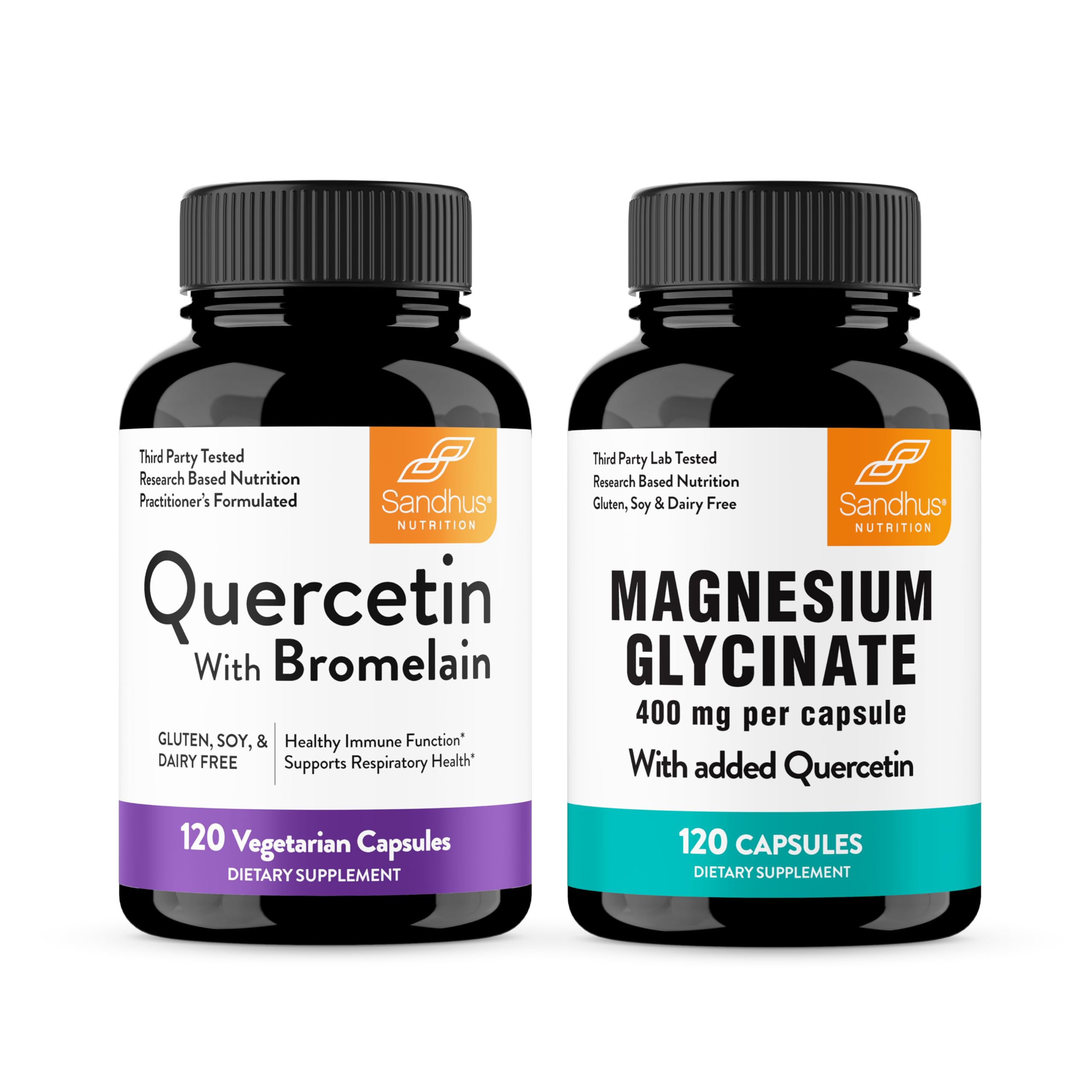 Our products are Manufactured with Globally Sourced Ingredients, packed, tested and distributed in the USA according to strict cGMP norms and made in NSF-certified facility. : Magnesium is the fourth most abundant mineral in our body which helps in relaxation quality sleep. : Sandhu's Magnesium Glycinate with Quercetin: Our formula features goodness of essential trace mineral magnesium along with natural flavonoid quercetin to support you with the full spectrum benefits of magnesium. : Quercetin is an antioxidant bioflavonoid that supports immune system, cellular health and immunity health, whereas Bromelain is a natural enzyme that helps healthy immune and respiratory functions. Our bromelain quercetin dihydrate supplement could be a good alternative to the readily available bromaline supplements containing quercetin bromelain stinging nettle, quercetin nettles, bromeliad with quercetin, corseting with bromelain, standalone quercetin 1000mg capsules. : Sandhu's quercetin with bromelain offers a convenient way to support your immune health. Our natural and premium quality quercetin is extracted from flower buds of sophora japonica trees and bromelain is derived from pineapple stems. Quercetin Bromelain, with their individual properties, could help support your overall health, thereby providing additional holistic benefits as compared to bromelain 500mg capsules.