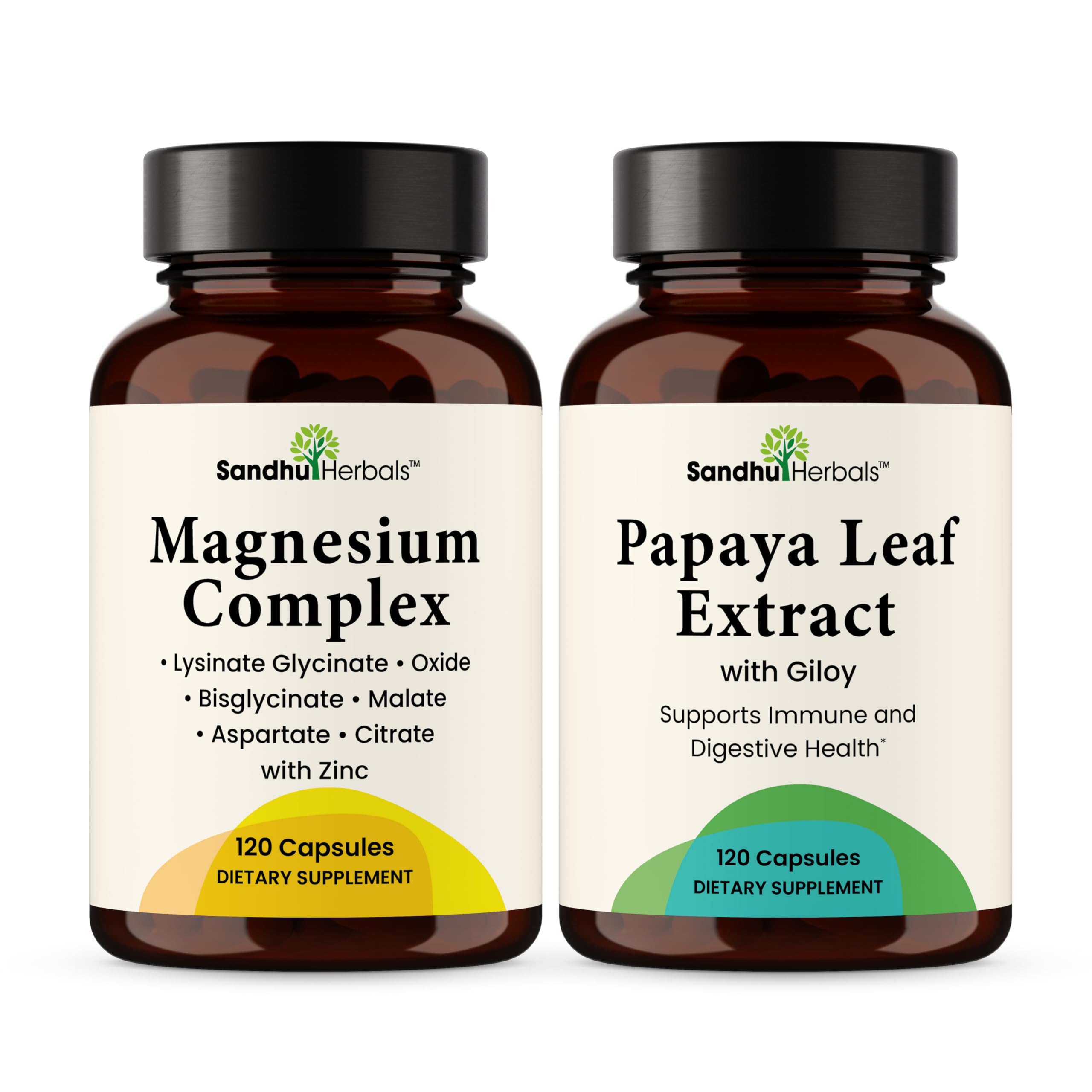 SANDHUHERBALS Magnesium Complex 6-in-1 Bundle with Papaya Leaf Extract Capsules (120 Count Each) | for Men & Women