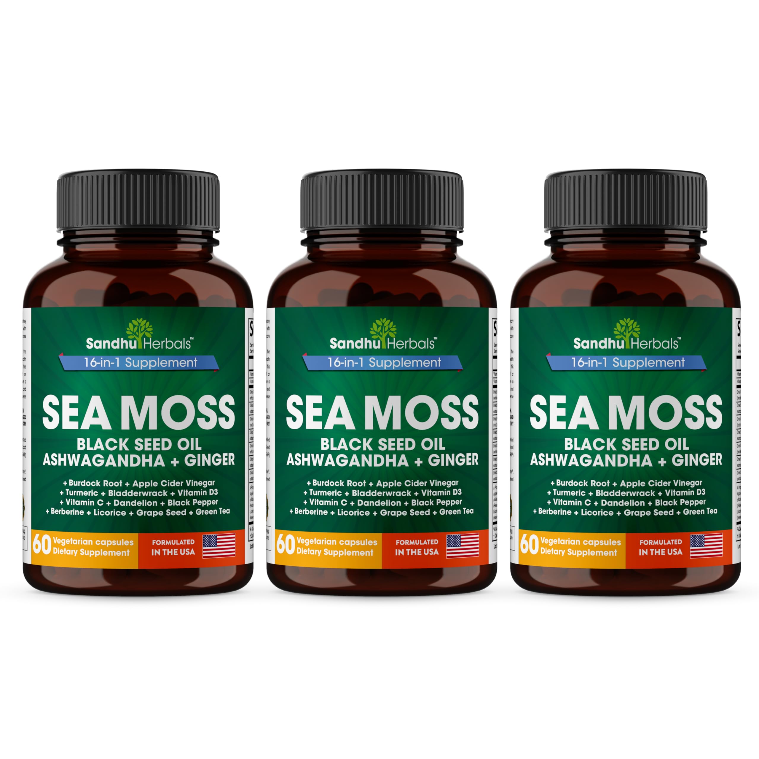 SPECIAL FEATURES: Sandhu Herbals Supplement for women and men contains ingredients like Sea Moss Black seed oil Ashwagandha Ginger, Burdock Root, Apple Cider Vinegar, Turmeric, Bladderwrack, Vitamin D3 C, Dandelion and Black Pepper. Our sea moss combines the benefits of these ingredients into one capsule which is easy to swallow.Sandhu Herbals Sea moss capsules are manufactured, packed, tested, and distributed in the USA according to strict cGMP norms and made in NSF-certified facility. Simplify your supplement by consolidating multiple bottles into just one formula from Sandhu Herbals. Presenting Sandhu Herbals Sea Moss, a blend comprising potent Seamoss Supplement, Black Seed Oil capsules, Aswagandha capsules, Burdock Root, Bladderwrack, and turmeric powder. Our blend incorporates Irish Seamoss, Bladderwrack, Burdock capsules and Aswagandha, enhanced by the inclusion of Black Seed Oil. DOSAGE SERVINGS: Serving size is 2 capsules per day or as recommended by your healthcare provider. With a supply of 90 Days from 180 Capsules, our sea moss capsules could be a good alternative to the readily available sea moss gummies, sea moss gel and other sea moss pills. Sandhu Herbals Seamoss Fusion is a blend of Sea Moss Pills, Black Seed Oil Pills, Ashwagandha Root, Bladderwrack Capsules, and Burdock Root Capsules, enhanced with 16 potent ingredients including turmeric curcumin capsules, Apple Cider Vinegar, ginger powder, dandelion root extract, Berberine HCl root extract, grape seed extract, green tea leaves extract and much more. These capsules provide a convenient option for men women seeking supplementation and are distinguished from standard raw organic sea moss or ashwagandha supplements. Our blend features wildcrafted sea moss and meticulously selected ingredients for a synergistic blend. QUALITY INGREDIENTS ENSURED: Sandhu Herbals wildcrafted sea moss is tested by third-party laboratories to ensure purity and high potency. It is Gluten free, soy free and dairy free. In addition to seamoss, black seed and ashwagandha, our supplement also contains the benefits of ginger, burdock root capsules, apple cider vinegar, turmeric with black pepper, bladderwrack and grape seed extract, thereby providing additional immune, digestive support benefits as compared to individual supplements like ashwagandha gummies, ashwagandha powder, ginger chews, ginger ale, black seed oil capsules and turmeric supplement. BENEFITS: Our Irish Sea moss capsules support immune, digestive, skin and hair health. These key benefits are due to the presence of seamoss black seed oil ashwagandha burdock root in our sea moss supplement. Discover Sandhu Herbals capsules, incorporating a potent blend of wildcrafted ingredients. Our product features a formula including Black Seed Powder, Ashwagandha Extract, full Irish Sea Moss Powder, Bladderwrack Powder, and Burdock Root Powder, all of which are carefully sourced. With this supplement, experience the benefits of black seed, ashwagandha powder, Irish sea moss wildcrafted, bladderwrack herb, and burdock root, conveniently packaged for effortless consumption. SPECIAL FEATURES: Sandhu Herbals Supplement for women and men contains ingredients like Sea Moss Black seed oil Ashwagandha Ginger, Burdock Root, Apple Cider Vinegar, Turmeric, Bladderwrack, Vitamin D3 C, Dandelion and Black Pepper. Our sea moss combines the benefits of these ingredients into one capsule which is easy to swallow.