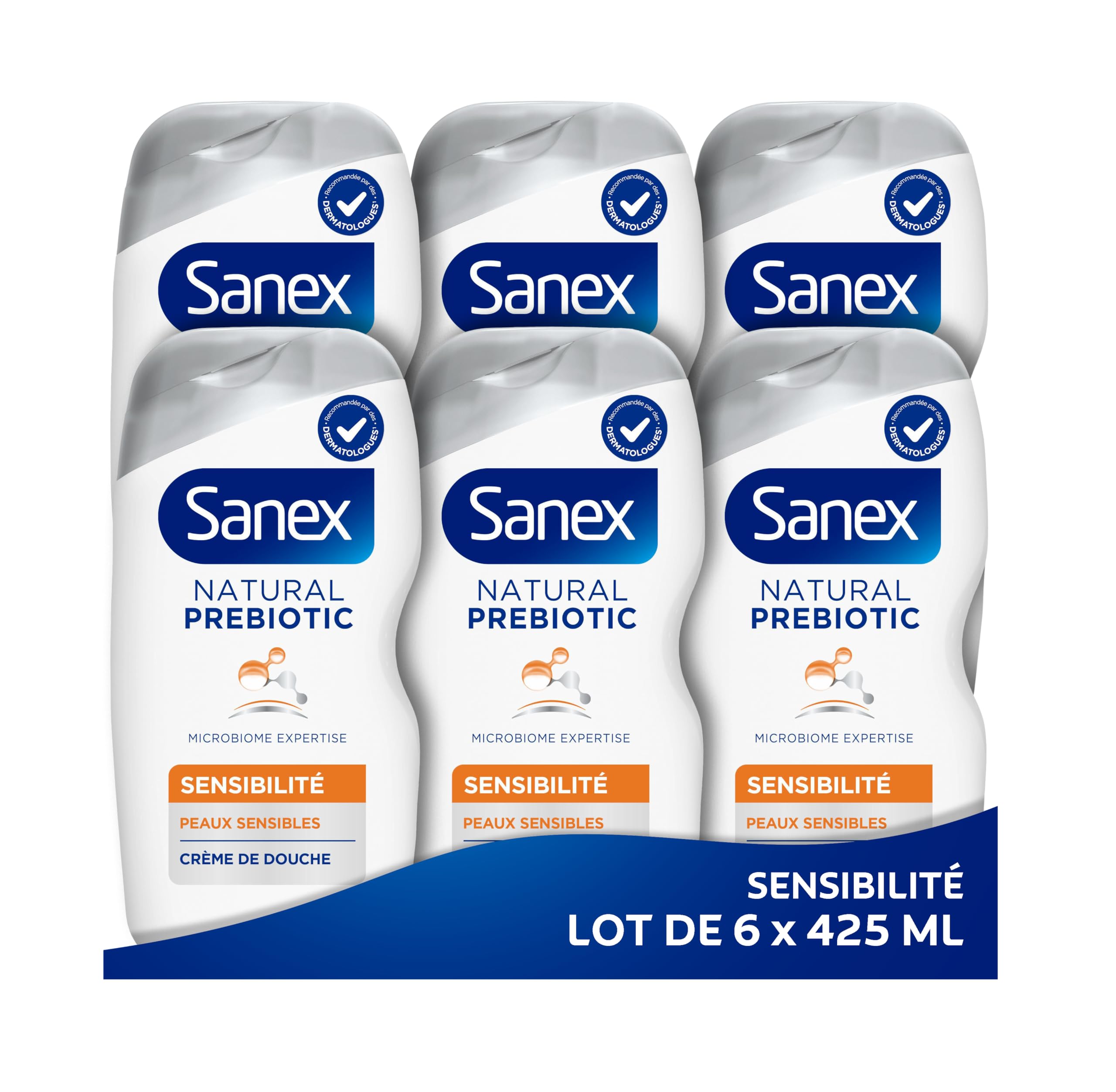 SANEX - Natural Prebiotic Peau Sensible- Gel douche formule Crème- Nettoie en Douceur - Minimise Risque d'Irritation - Complexe Prébiotique Postbiotique - Testé Dermatologiquement -Lot de 6 X 425mL