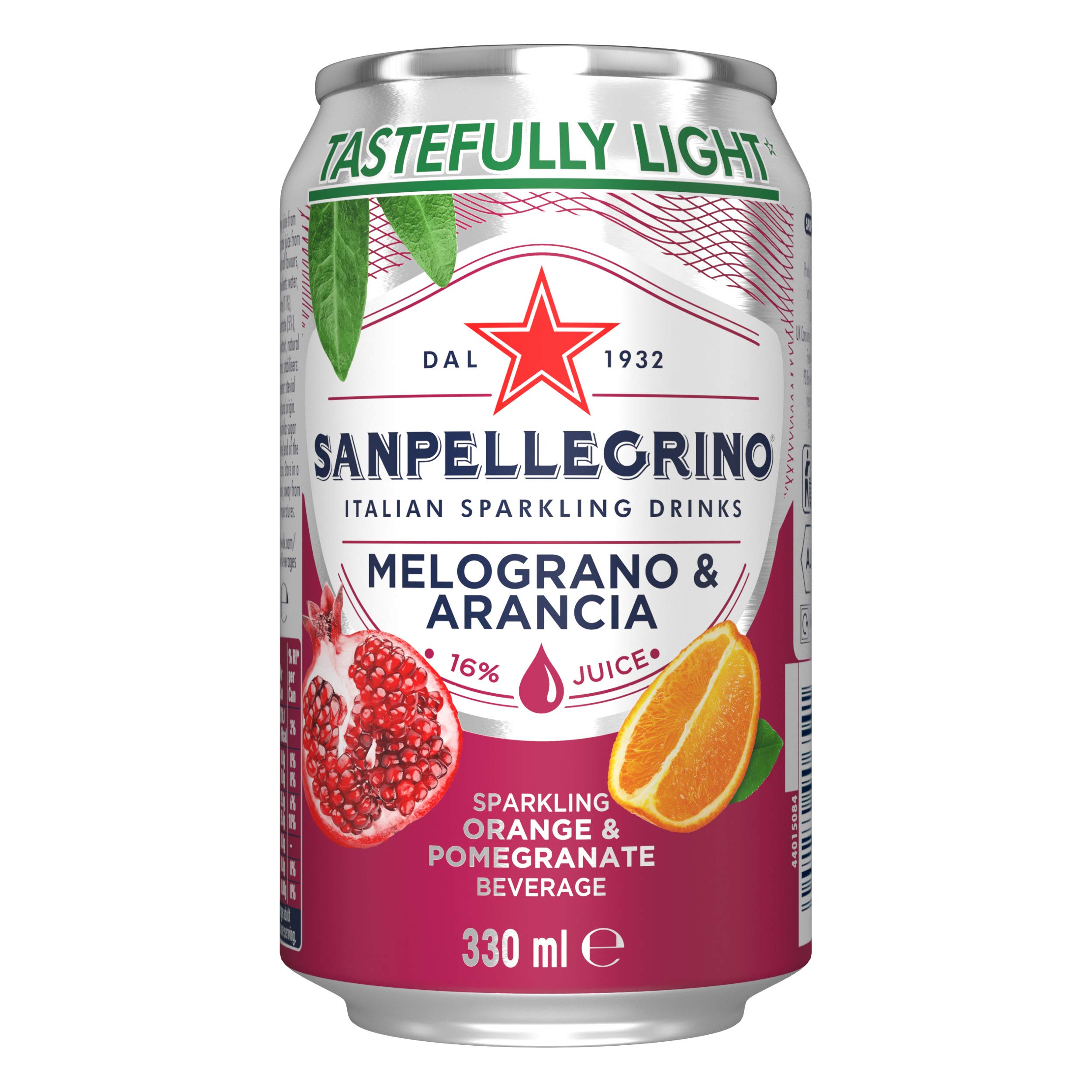 The glistening rosy-red and light effervescence of sanpellegrino melograno arancia is love at first sight. Made with the delicious juices of oranges and pomegranate, melograno arancia blooms with the flavour of gently squeezed orange juice paired with the exciting taste of pomegranate. Notes of sun-ripened oranges blend expertly with elegant pomegranate creating a delicious tartness that is just on the right side of sweet.Twenty-four 330ml cans. 100 Percent recyclable aluminum can with foil cover ensures quality freshness and 24 Pack is easy to store for colorful moments at your convenience. Made of distinctive ingredients, discover a vibrant and surprising flavour mix of real fruit juice and refreshing bubbles, with no artificial sweeteners. Sparkling orange pomegranate beverage with 11 orange juice and 5 pomegranate juice from concentrate with other natural flavours.