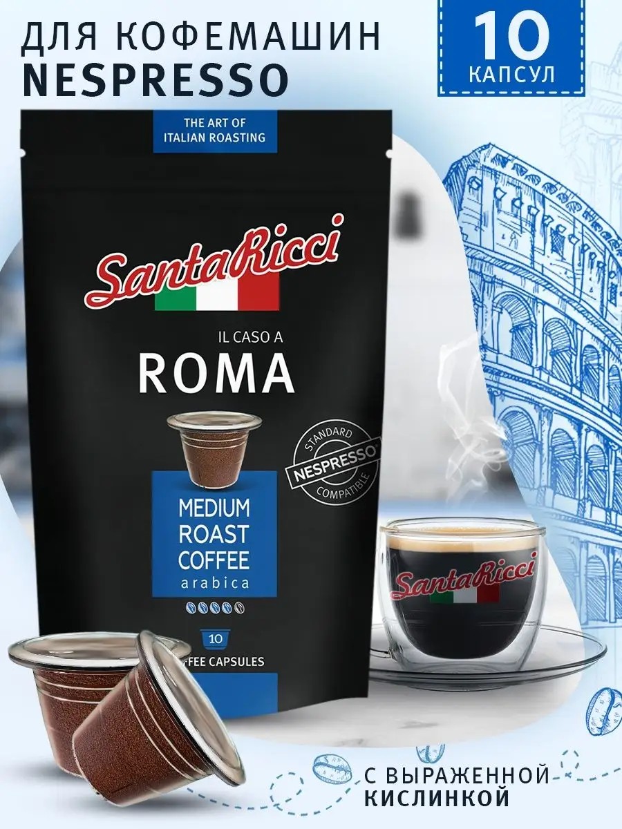 Looking for the perfect coffee that combines a rich aroma and refined flavor? If you're a connoisseur of true coffee, then Santa Ricci Roma capsule coffee is the perfect choice! Santa Ricci Roma capsules contain a blend of the finest medium-roasted Arabica beans with a vibrant aroma of blackcurrant, blackberry, and prune. The finished drink has a pleasant creamy texture, pronounced acidity, a persistent crema, and a refined bitterness. Thanks to the hermetically sealed capsules, our product retains all its qualities, freshness, and flavor. Each capsule contains a serving of ground coffee suitable for a 30-50 ml cup. Medium-roasted beans are ideal for making espresso and Americano. You can add milk, cream, and some spices to the finished hot drink. Santa Ricci Roma packaging makes the perfect gift that is sure to delight any coffee lover in your circle. Buy coffee for your mom, dad, grandma, grandpa, your significant other, your girlfriend, a close friend, or a favorite teacher. You can give coffee for birthdays, anniversaries, March 8th, February 23rd, New Year's, or just for no reason at all. Discover new dimensions of coffee enjoyment today. The set includes 10 capsules. For use in a capsule coffee machine. The capsules are compatible with Nespresso coffee machines.