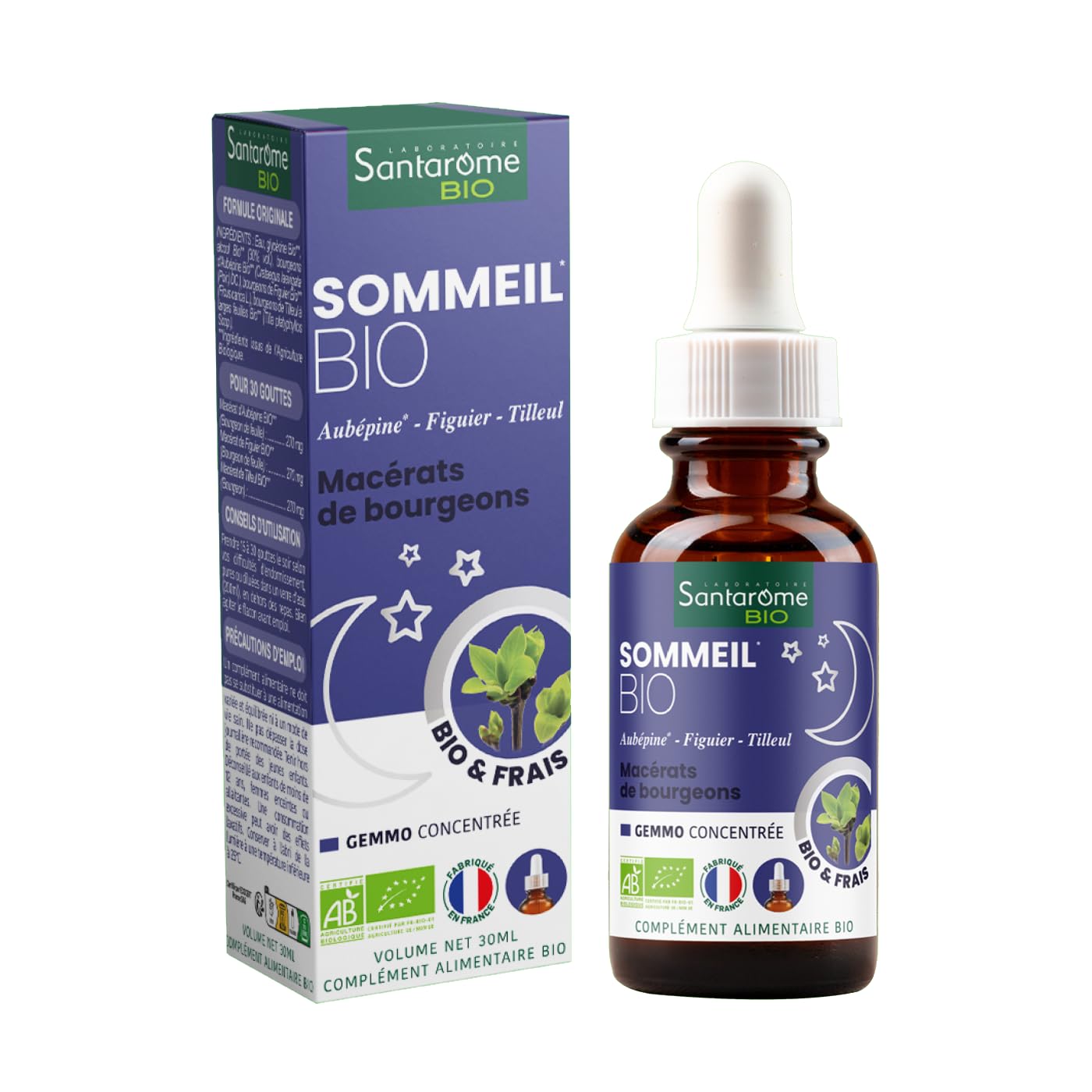Sleep from Santarome Bio is a tri-complex of organic hawthorn, fig and lime buds, which reduces nervousness, particularly in cases of difficulty falling asleep. 100 ORGANIC and 100 Vigan. True elixirs, our buds are a concentrate of all the active ingredients of the plant (totum). we always combine them in 3s in order to act on the general balance of the body. Santarome Bio bud maceras are prepared according to Dr. Pol Henry's method: maceration for 21 days in a mixture of 1 3 water 3 alcohol 1 3 glycerin. These organic buds were hand-picked in France by professional pickers. INGREDIENTS INGREDIENTS: Glycerinated macerates made from equal parts of ORGANIC buds: Hawthorn (Crataegus laevigata (Poir.) DC.), Fig (Ficus carica L.) and Broad-leaved lime (Tilia platyphyllos Scop.). Alcohol: 30 vol. Ingredients from Organic Farming. SAFETY WARNING This food supplement should not replace a varied and balanced diet and a healthy lifestyle. Do not exceed the recommended daily dose. Keep out of reach of young children. Not recommended for pregnant or breastfeeding women. Excessive consumption can have laxative effects. The presence of a slight deposit due to the use of organic plants does not call into question the quality of the product. ECO-RESPONSIBLE, VEGAN AND SUITABLE FOR EVERYONE: No artificial colors, no preservatives, no artificial flavors and not tested on animals. Suitable for vegetarian, vegan, gluten-free, lactose-free diets. Respectful of nature and ECOCERT certified. MADE IN FRANCE: Made in France by experts in their field (near Avignon), our Sleep gemmotherapy food supplement is subject to strict controls guaranteeing you impeccable quality. EASY TO TAKE: Take 15 to 30 drops per day depending on your difficulty falling asleep, outside of meals! Pure or diluted in a glass of water (20cl)!. 100 ORGANIC PLANT-BASED FORMULA! Our formula is based on 3 organic and fresh buds. Hawthorn reduces nervousness, especially in cases of insomnia. Fig makes it easier to fall asleep, and Linden promotes sleep and increases its duration! FALLING ASLEEP AND QUALITY SLEEP. Our Sleep food supplement de-stresses, soothes, and relaxes for a peaceful sleep! It promotes falling asleep. Ideal for people who have difficulty falling asleep or suffer from insomnia! Sommeil de Santarome Bio est un tri-complexe de bourgeons bio Aubépine, figuier et tilleul, qui réduit la nervosité, notamment en cas de difficultés d'endormissement. 100 BIO et 100 Vigan. Véritables élixirs, nos bourgeons sont un concentré de tous les principes actifs de la plante (totum). nous les associons toujours par 3 afin d'agir sur l'équilibre général du corps. Les macéras de bourgeons Santarome Bio sont préparés selon la méthode du Dr pol Henry: macération pendant 21 jours dans un mélange 1 3 eau 3 alcool 1 3 glycérine. Ces bourgeons bio ont été cueillis à la main en France par des cueilleurs professionnels. INGRÉDIENTS INGRÉDIENTS : Macérats glycérinés à parties égales de bourgeons BIO : Aubépine (Crataegus laevigata (Poir.) DC.), Figuier (Ficus carica L.) et Tilleul à larges feuilles (Tilia platyphyllos Scop.). Alcool : 30 vol. Ingrédients issus de l'Agriculture Biologique. AVERTISSEMENT DE SÛRETÉ Ce complément alimentaire ne doit pas se substituer à une alimentation variée et équilibrée et à un mode de vie sain. Ne pas dépasser la dose journalière recommandée. Tenir hors de portée des jeunes enfants. Déconseillé aux femmes enceintes ou allaitantes. Une consommation excessive peut avoir des effets laxatifs. La présence d'un léger dépôt dû à l'utilisation de plantes Bio ne remet pas en cause la qualité du produit. ÉCO-RESPONSABLE, VEGAN ET ADAPTÉ À TOUS: Sans colorants, sans conservateurs, sans arômes artificiels et non testés sur les animaux. Adaptés aux régimes végétariens, végans, sans gluten, sans lactose. Respectueux de la nature et certifiés ECOCERT. MADE IN FRANCE : Fabriqué en France par des experts en leur domaine (près d'Avignon), notre complément alimentaire à base de gémmothérapie Sommeil est soumis à des contrôles stricts vous garantissant une qualité irréprochable. FACILE À PRENDRE : Prendre 15 à 30 gouttes par jour selon vos difficultés d'endormissement, en dehors des repas ! Pures ou diluées dans un verre d'eau (20cl) !. FORMULE 100 BIO À BASE DE PLANTES ! Notre formule est à base de 3 bourgeons Bio et Frais. L'Aubépine réduit la nervosité, surtout en cas d'insomnies. Le Figuier facilite l'endormissement et le Tilleul favorise le sommeil et en augmente la durée !. ENDORMISSEMENT ET SOMMEIL DE QUALITE. Notre complément alimentaire Sommeil déstresse, apaise et relaxe pour un sommeil paisible ! Il favorise l'endormissement. Idéal pour les personnes ayant des difficultés à s'endormir ou des insomnies !.