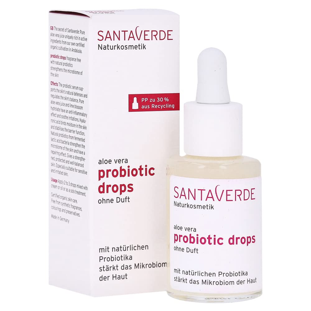 INGREDIENTS Aloe Barbadensis Leaf Juice , Tilia Cordata Flower Water , Alcohol , Glycerin, Lactobacillus Ferment Lysate, Salix Nigra Bark Extract, Sodium Lactate, Prunus Armeniaca Kernel Oil , Leuconostoc Radish Root Ferment Filtrate, Sodium Hyaluronate, Lactic Acid, Levulinic Acid, Chhon. Drus Crispus Powder, sodium levulinate, sodium phytates, glucose, sodium hydroxide. From controlled organic cultivation INSTRUCTIONS FOR USE After cleansing and toning, apply 2 to 3 drops mixed with cream or oil or as a solo care to the face, neck and décolleté and massage gently.Freely sellable. 30 ml. PZN-17585482.SantaVerde Aloe Vera Probiotic Drops 30 ml INGREDIËNTEN Aloë Barbadensis Leaf Juice , Tilia Cordata Flower Water , Alcohol , Glycerine, Lactobacillus Ferment Lysate, Salix Nigra Bark Extract, Sodium Lactate, Prunus Armeniaca Kernel Oil , Leuconostoc Radish Root Ferment Filtraat, Natriumhyaluronaat, lactisch zuur, Levulinic zuurzuur, chhon. Drus Crispus Powder, natriumlevulinaat, natriumfytaten, glucose, natriumhydroxide. Van gecontroleerde biologische teelt GEBRUIKSAANWIJZING Na het reinigen en toniseren 2 tot 3 druppels gemengd met crème of olie of als solo-verzorging op gezicht, hals en decolleté aanbrengen en zachtjes inmasseren.Vrij verkoopbaar. 30 ml. PZN-17585482.