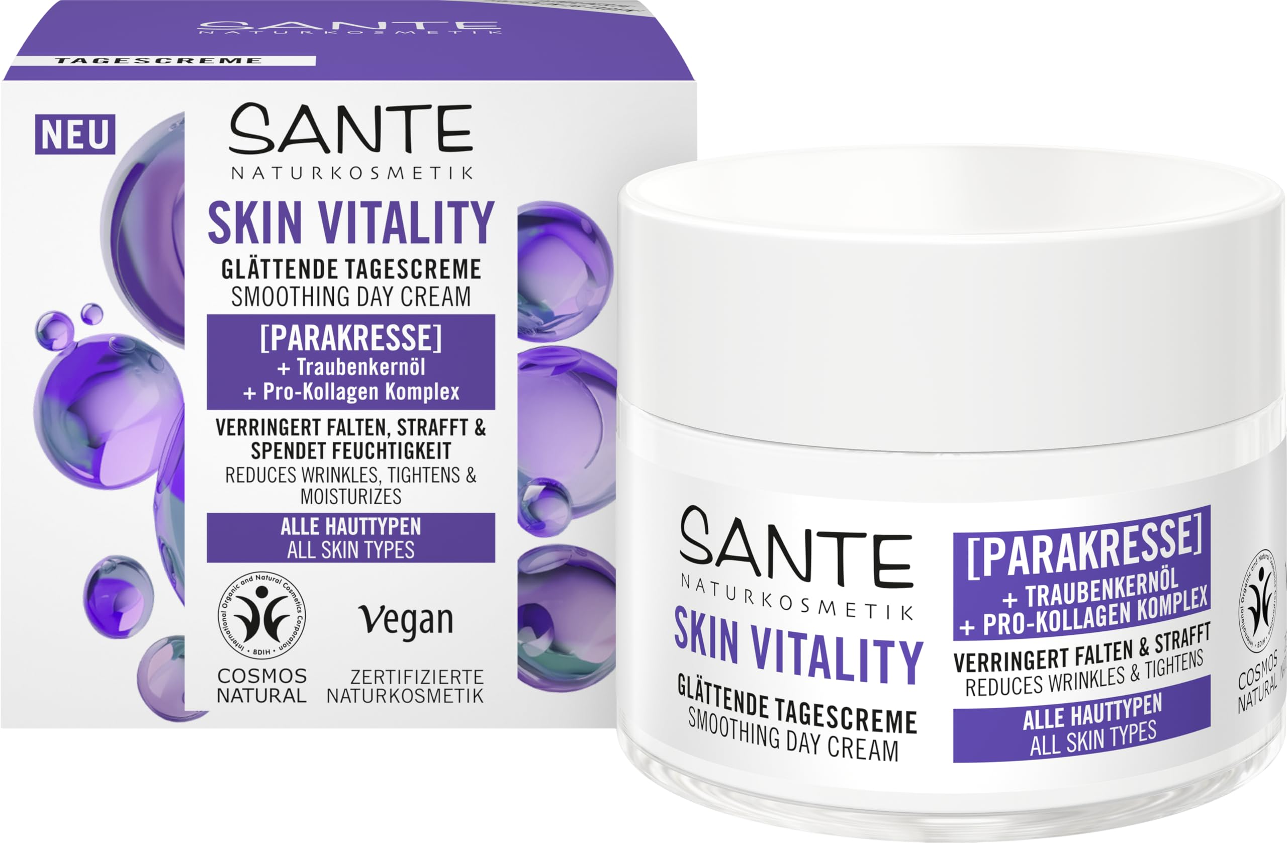 SANTE Skin Vitality Smoothing Day Cream works from the first signs of wrinkles and restores radiance to tired, dull skin. For daily use. SAFETY WARNING Example of a gel, sensitive to heat, store in a dry environment, sensitive to light, not stackable, do not store above 25 CContents: 1 Sante Naturkosmetik Face Skin Vitality Day Cream (50 ml). Sustainability: The formula is BDIH COSMOS NATURAL certified, vegan, and composed of purely natural ingredients. It contains no synthetic perfumes, colorants, or mineral oils for environmentally friendly skincare. How to use: Apply the cream morning and evening after cleansing, evenly to the face, neck, and décolleté. Gently massage for optimal absorption of the ingredients and to promote skin regeneration. Result: The face cream softens fine lines and wrinkles and promotes a smooth skin texture. It deeply moisturizes and improves skin elasticity for a healthy complexion. This day cream combines precious ingredients to smooth the skin. Para cress firms the skin, and grapeseed oil protects it from external aggressors, while the pro-collagen complex strengthens and tones the skin.SANTE Naturkosmetik Face Skin Vitality Crème de jour revitalisante avec cresson de parac, huile de pépins de raisin et pro-collagène, crème anti-âge pour tous les types de peau, 50 mlDESCRIPTION DU PRODUIT DESCRIPTION DU PRODUIT La crème de jour lissante SANTE Skin Vitality agit dès les premières rides et redonne de l'éclat aux peaux fatiguées et ternes. Pour une utilisation quotidienne sur la peau. AVERTISSEMENT DE SÉCURITÉ Exemple de gel, sensible à la chaleur, stockage dans un environnement sec, sensible à la lumière, non empilable, ne pas stocker à plus de 25 CContenu de la livraison : 1 crème de jour Sante Naturkosmetik Face Skin Vitality (50 ml). Durabilité : la formule est certifiée BDIH COSMOS NATURAL, végétalienne et se compose d'ingrédients purement naturels. Elle ne contient pas de parfums ni de colorants synthétiques ni d'huiles minérales pour un soin respectueux de l'environnement. Utilisation : appliquez la crème de soin matin et soir après le nettoyage uniformément sur le visage, le cou et le décolleté. Masser doucement pour une absorption optimale des ingrédients et favoriser la régénération de la peau. Résultat : la crème pour le visage adoucit les ridules et les ridules et favorise une texture de peau lisse. Elle hydrate en profondeur et améliore l'élasticité de la peau pour favoriser un teint sain. Le soin de jour combine des ingrédients précieux pour lisser la peau. Le cresson de para raffermit la peau et l'huile de pépins de raisin préserve la peau des agressions extérieures, tandis que le complexe pro-collagène renforce et donne de la tonicité.