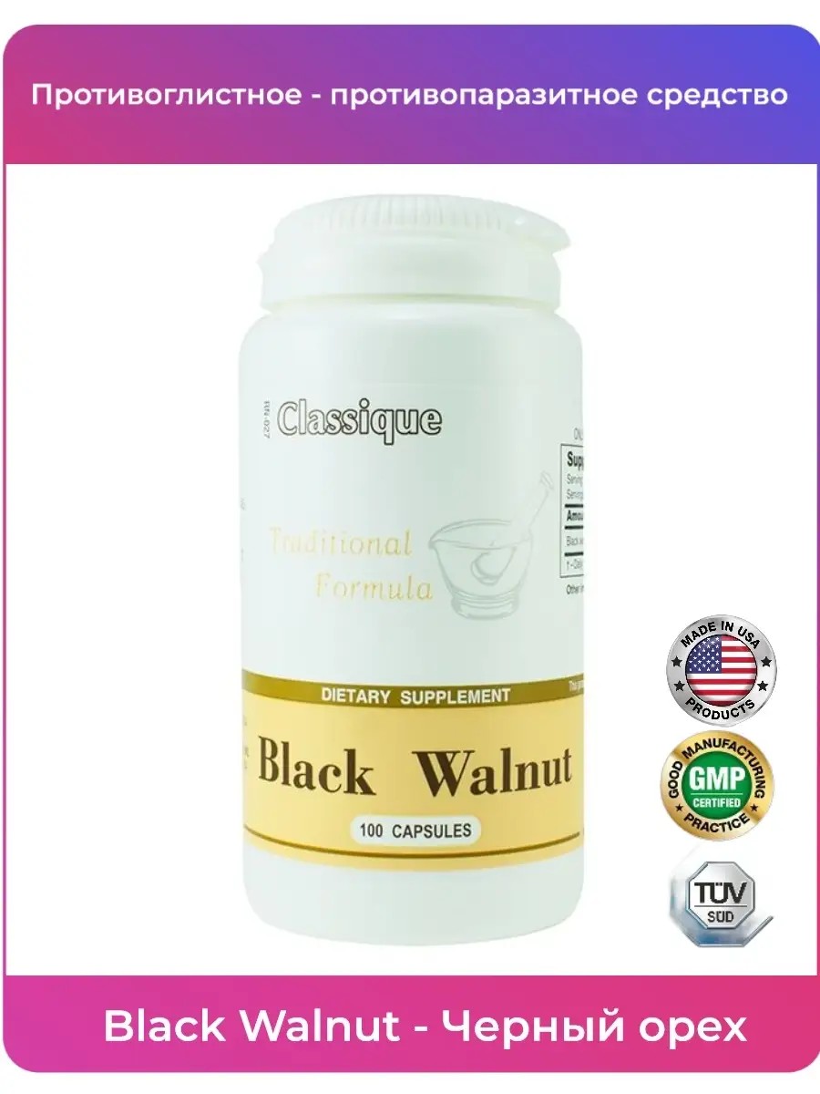 Black Walnut Santegra Ingredients: Black walnut shells (Juglans nigra) 430 mg. Black walnut shells contain organic iodine, fluoride, iron, potassium, vitamins A and C, B vitamins, tannins, proteins, and bioflavonoids. The abundance of nutrients makes black walnuts widely used. The main active ingredient in black walnut is juglone, a phenolic compound with antibacterial, antifungal, antiviral, and antiparasitic properties. These properties make black walnut a natural remedy for parasites. To prevent parasitic infestations, it is recommended to take this product twice a year. Directions: Take 2 capsules 3 times daily with meals with a glass of water. Duration of use: 1 month. Contraindications: Individual intolerance, diffuse toxic goiter, thyrotoxicosis.