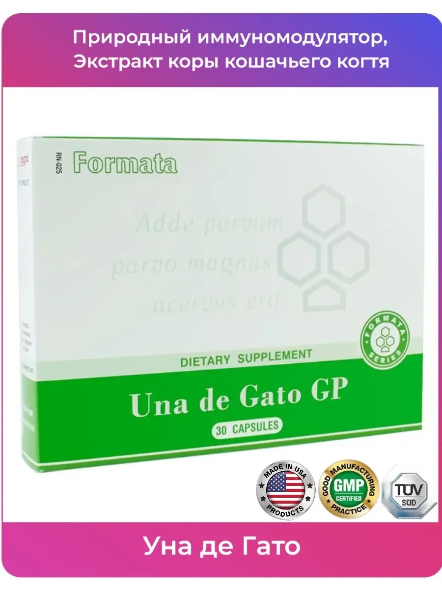 Состав Una de Gato: стандартизованный экстракт (4:1) коры кошачьего когтя (3% общих оксиндоловых алкалоидов) (эквивалентно 1400 мг порошка из коры кошачьего когтя) 350 мг.Природный иммуномодулятор, содержит стандартизованный (3% общих оксиндоловых алкалоидов) экстракт коры кошачьего когтя, что гарантирует эффективность продукта. Uncaria tomentosa произрастает на территории Перу и соседних стран в тропических лесах Амазонки. Индейцы из перуанских племен на протяжении 2000 лет считают Уна де Гато священным растением средством от всех болезней.Кора кошачьего когтя использовалась местными жителями при лихорадке, воспалениях, артрите, ревматизме, гастрите, язвах желудка, диаррее, астме, диабете, опухолях, при инфекциях мочевыводящих путей, для обработки ран, при проблемах кожи, в качестве тонизирующего средства, и даже в качестве средства контрацепции. Применение: По 1 капсуле в день во время еды, запивая стаканом воды. Противопоказания: Индивидуальная непереносимость компонентов, входящих в состав БАД.