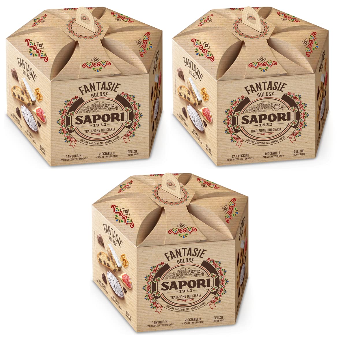The fantastic Golose is the ideal gift for lovers of Tuscan pastry art. Inside, you'll find a wide range of products to tastefully enhance your festive moments: from gourmet Capricci to inviting fig and walnut wasps, to incomparable cantuccini with chocolate flakes. The Fantasie Golose pairs perfectly with a good natural straw red wine with intense notes of fruit and spice. Ingredients: Chocolate Cantuccini - wheat flour, sugar, chocolate chips and pieces 22.5 (sugar, cocoa mass, cocoa butter, emulsifier: soy lecithin, natural flavorings), fresh free-range egg yolk 4.5 , fresh free-range eggs 4.5 , pasteurized fresh. Whole milk 4.5 . Cooking butter: disodium diphosphate - sodium bicarbonate, honey 0.4 , salt, flavorings. May contain nuts and sesame seeds. - Almond, cocoa, and cocoa bean bowl - Sugar, almonds 40 , powdered sugar 6 (sugar, corn starch), soluble chicory fiber, cocoa bean protein 4 , cocoa powder 2 , chocolate powder (cocoa powder, cocoa powder, corn), corn sugar paste, flavorings, preservatives: sorbic acid, raising agent: ammonium bicarbonate, salt. May contain wheat, milk, soy, and other nuts. - Fig and nut sweets: sugar, wheat flour, dried figs 16 , walnuts 16 , raisins 10 , glucose-fructose syrup, powdered sugar 9 (sugar, corn starch), hazelnuts 2 , rice flour, embossed starch 0.5 (potato starch, water). May contain soy and other nuts.Sapori Fantasy Golose Lot de 3 produits de boulangerie Spécialités de Noël italiennes 367 gDESCRIPTION DU PRODUIT Le fantastique Golose est le cadeau idéal pour les amateurs d'art de pâtisserie Toscan. À l'intérieur, vous trouverez une large gamme de produits pour remplir vos moments de fête avec goût : des gourmet-Capricci aux guêpes invitantes de figue et de noyer aux cantuccini incomparables avec des flocons de chocolat. Le Fantasie Golose est parfaitement accompagné d'un bon vin rouge paille naturel aux notes intenses de fruits et d'épices. Ingrédients : Cannucini au chocolat - farine de blé, sucre, gouttes et morceaux de chocolat 22,5 (sucre, pâte de cacao, beurre de cacao, émulsifiant : lécithine de soja, arômes naturel), jaune d'œuf frais de poules en terre 4,5 , œufs frais en plein air 4,5 , pasteurisé frais. Llait entier 4, 5 Beurre de cuisson : diphosphate disodique - bicarbonate de sodium, miel 0,4 , sel, arômes. Peut contenir des fruits à coque et des graines de sésame. - Bol en amandes, cacao et haricots de cacao - Sucre, amandes 40 , sucre en poudre 6 (sucre, amidon de maïs), fibres solubles de Chicorée, protéines de fèves de cacao 4 , poudre de cacao 2 , poudre de chocolat (poudre de cacao, poudre de cacao maïs), pâte de sucre maïs. ), arômes, conservateurs : Acide sorbique, agent de levure : bicarbonate d'ammonium, sel. Peut contenir du blé, du lait, du soja et d'autres fruits à coque. - Sucreries aux figues et noix de sucre, farine de blé, figues séchées 16 , noix 16 , raisins 10 , sirop de glucose fructose, sucre en poudre 9 (sucre, amidon de maïs), noisettes 2 , farine de riz, amidon gaufré 0,5 (fécule de pomme de terre, eau). Peut contenir du soja et d'autres fruits à coque.
