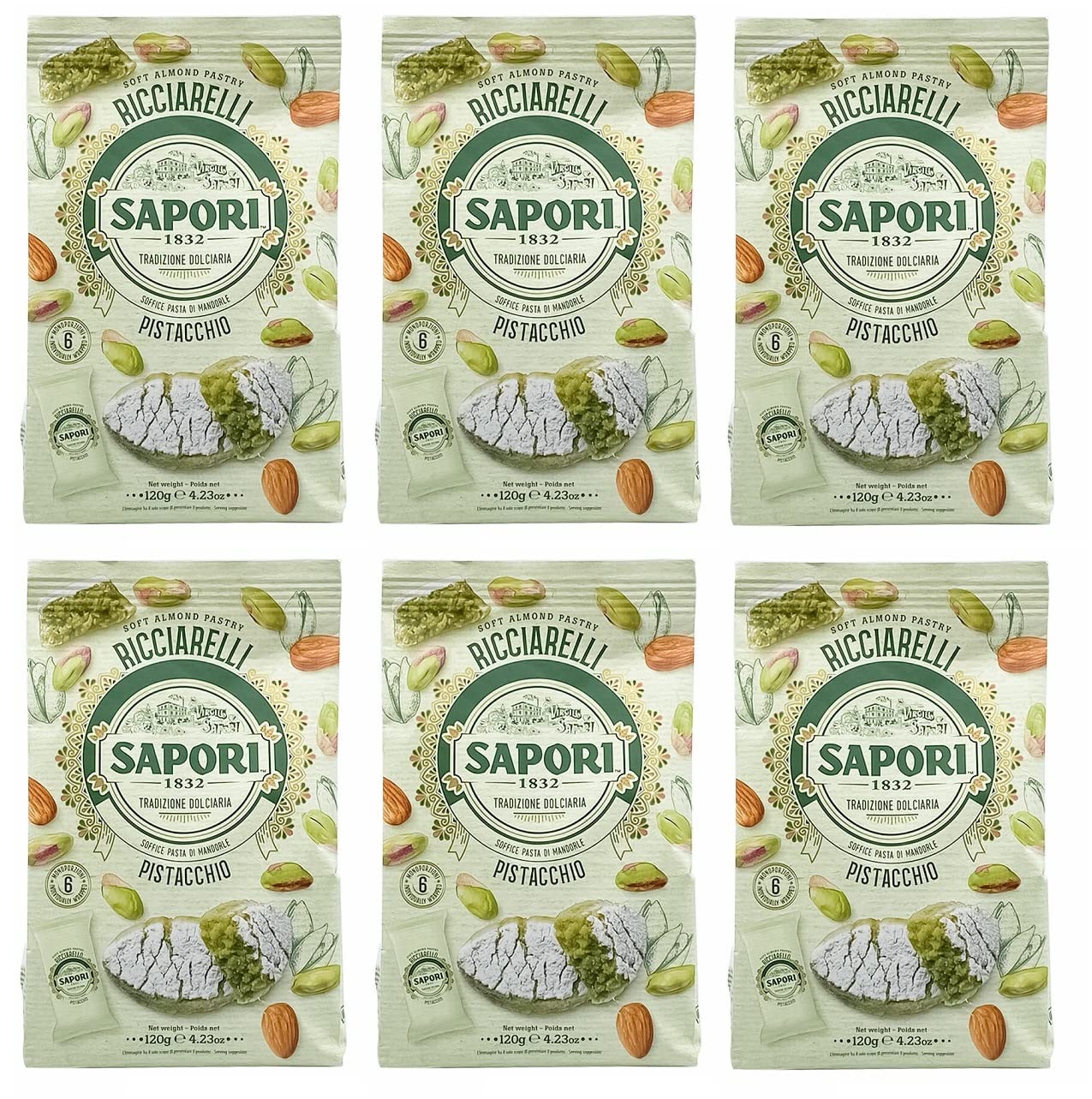 In every Sapori 1832 Ricciarello lies the expertise of our master blenders: aromatic pistachios and almonds combine to create a Ricciarello with a rich, enveloping taste and an incomparable aroma. A unique delight for the palate. Ricciarelli pistachios are named after Ricciardetto della Gherardesca, who, after returning from crossbreeding, brought some marzipan sweets to Tuscany, where they were an immediate and enduring success. Ricciarelli pistachios are perfect on their own or paired with a classic Vin Santo di San Gimignano, made from the historic Malvasia, Trebbiano, and San Colombano grapes and distinguished by aromas of raisins, hazelnuts, and roasted almonds. Warm and harmonious, it has a long, fruity, and lemony finish that pairs perfectly with the marzipan. Pistachio pastilles: sugar - almonds 35 - powdered sugar 8 (sugar, corn starch) - soluble chicory fiber - fresh free-range pasteurized egg white - pistachio paste 4 - flavorings - preservative: sorbic acid - raising agents: ammonium carbonate - salt. May contain wheat, milk, soy, and other nuts. Nutritional values per 100g: energy 2009 kJ 482 - fat 27g of which saturates 8.8g - carbohydrate 46g of which sugars 44g - fiber 9.4g - protein 9.0g - salt 0.14g. INGREDIENTS Sugar – Almonds 35 – Powdered sugar 8 (sugar, corn starch) – Chicory soluble fiber – Fresh, free-range pasteurized protein – Pistachio paste 4 – Flavorings – Preservative: sorbic acid – Raising agent: ammonium bicarbonate – Salt. May contain wheat, milk, soy, and other tree nuts.Sapori Ricciarelli al Pistacchio Lot de 6 pâtes d'amande pistache amande 120 g sachets de spécialités italiennes de Noël 6 portions individuelles de 20 gDESCRIPTION DU PRODUIT DESCRIPTION DU PRODUIT Dans chaque Sapori 1832 Ricciarello se trouve toute l'expérience de nos maîtres condensateurs : les pistaches et les amandes aromatiques se combinent pour donner vie à un Ricciarello avec un goût enveloppant et un arôme incomparable. Un plaisir unique pour le palais. Les pistazies Ricciarelli ont le nom de Ricciardetto della Gherardesca, qui, après leur retour des croisements, a apporté quelques bonbons à la pâte d'amande dans la Toscane, qui ont été immédiatement et jusqu'à présent un succès incontestable. Les pistacchio Ricciarelli sont parfaits seuls ou en combinaison avec un classique Vin Santo di San Gimignano, obtenu à partir des raisins historiques Malvasia, Trebbiano et San Colombano et se distinguent par les arômes de raisins secs, noisettes et amandes grillées. Chaud et harmonieux, il a une longue persistance fruitée et citronnelle qui se marie parfaitement avec la pâte d'amande. Pastilles à la pstaie : sucre - amandes 35 - sucre en poudre 8 (sucre, amidon de maïs) - fibres solubles chicorée - blanc d'oeuf pasteurisé frais en plein air - pâte pistache 4 - arômes - conservateur : acide sorbie - levée Agents : hydrohydrohydrod'ammonCarbonate - Sel Peut contenir du blé, du lait, du soja et d'autres fruits à coque. Valeurs pour 100 g : énergie 2009 kJ 482 - Matières grasses 27 g dont acides gras saturés 8,8 g - Hydrate de charbon 46 g dont sucre 44 g - Fibres 9,4 g - Protéine 9,0 g - Sel 0,14 g. INGRÉDIENTS Sucre – Amandes 35 – Sucre en poudre 8 (sucre, amidon de maïs) – Chicorée fibres solubles – Protéines pasteurisées fraîches en plein air – Pâte de pistache 4 – Arômes – Conservateur : acide sorbique – levant: hydrogénocarbonate d'ammonium – sel. Peut contenir du blé, du lait, du soja et d'autres fruits à coque.