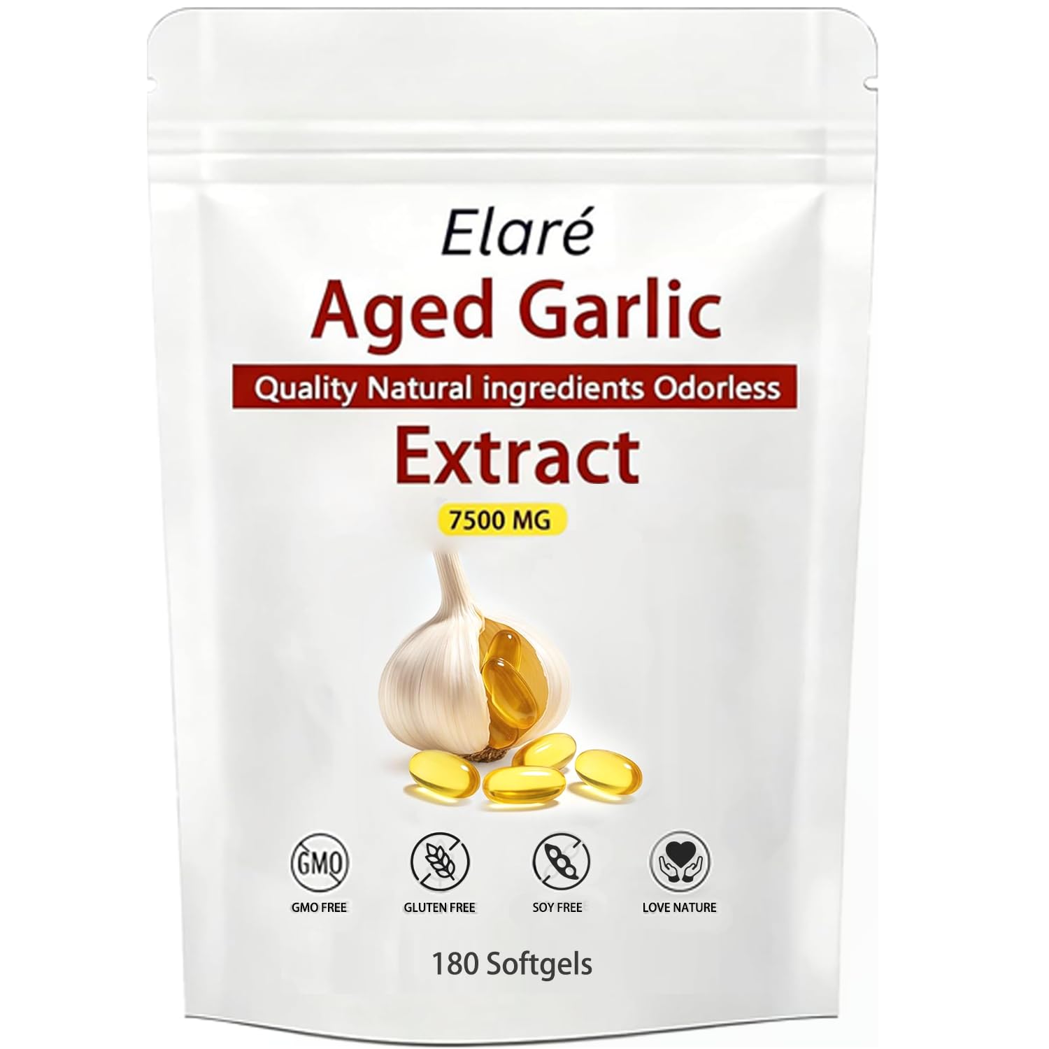 SAPURAIS Elare Aged Garlic Extract - 7500mg Odorless Organic Garlic Extract Capsules | Organic Non-GMO Gluten-Free(180 Softgels)