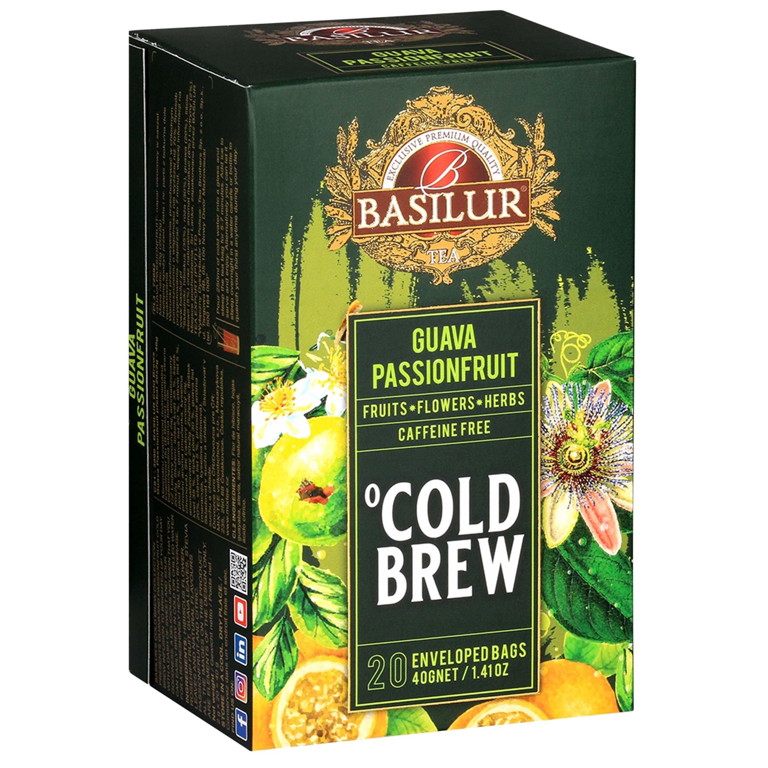 A wonderful decaffeinated fruit tea made with hibiscus, rosehip, guava leaves, stevia, and natural passion fruit and citrus flavors, it's a perfect choice for fruit tea lovers. Thanks to a careful selection of ingredients, this tea offers a wonderfully fragrant infusion with a unique taste. Its convenient and quick preparation allows for easy brewing simply steep the tea bag in hot or cold water, according to your preference. Caffeine-free, ideal for children and those avoiding caffeine, this tea is a healthy alternative at any time of day. The refreshing aroma of passion fruit and citrus makes every cup a true feast for the senses. Net weight: 40 g Number of tea bags: 20 Ingredients: Hibiscus (35 ), rosehip (30 ), guava leaves (20 ), stevia leaves (5 ), and natural passion fruit (8 ) and lemon (2 ) flavoring. Country of origin: Sri Lanka (Ceylon). You'll love the taste of Basilur Cold Brew tea, hot or cold! Cold Brew Preparation: Pour 250 ml of cold water over the tea. Steep for 5 to 7 minutes. Add ice cubes for iced tea. Alternatively, place the tea bag in a bottle or carafe of cold water and let it steep overnight. Classic Hot Brew Preparation: Pour 250 ml of hot water (100 C) over the tea. Steep for 5 to 7 minutes. INSTRUCTIONS Pour 250 ml of hot water (100 C) over the tea. The steeping time should be between 5 and 7 minutes. For cold brew, pour 250 ml of cold water over the tea and let it steep for 5 to 7 minutes. You can add ice cubes for iced tea. Alternatively, place the tea bag in a bottle or carafe of cold water and let it steep overnight. SAFETY WARNING Contains hibiscus, which may interact with certain medications. Keep out of reach of children. Do not use if you have a known allergy to any of the ingredients. If any adverse reactions occur, discontinue use and consult a doctor. See moreBASILUR Cold Brew - Thé fruité décaféiné aux arômes de fruit de la passion et d'agrumes, thé froid en sachets 20 x 2 g (1)DESCRIPTION DU PRODUIT DESCRIPTION DU PRODUIT Un merveilleux thé fruité décaféiné composé d'hibiscus, de cynorrhodon, de feuilles de goyave, de stévia ainsi que d'arômes naturels de fruit de la passion et d'agrumes, c'est un choix parfait pour les amateurs d'infusions fruitées. Grâce à une sélection minutieuse d'ingrédients, ce thé offre une infusion merveilleusement parfumée au goût unique. Sa version pratique et rapide permet une préparation facile, il suffit d'infuser le sachet dans de l'eau chaude ou froide, selon les préférences. Sans caféine, idéal pour les enfants et les personnes évitant cet ingrédient, ce thé est une alternative saine à tout moment de la journée. L'arôme rafraîchissant de fruit de la passion et d'agrumes fait de chaque tasse une véritable fête pour les sens. Poids net : 40 g Nombre de sachets : 20 pcs. Ingrédients : hibiscus (35 ), cynorrhodon (30 ), feuilles de goyave (20 ), feuilles de stévia (5 ) et arôme naturel de fruit de la passion (8 ) et de citron (2 ). Pays de fabrication : Sri Lanka (Ceylan) Vous allez adorer le goût du thé Basilur Cold Brew en version chaude ou froide ! Préparation du Cold Brew (froid) : Verser 250 ml d'eau froide sur le thé. Le temps d'infusion doit être compris entre 5 et 7 minutes. Vous pouvez ajouter des glaçons pour obtenir un thé glacé. Autre solution : Placez le sachet de thé dans une bouteille ou une carafe d'eau froide et laissez-le reposer toute la nuit. Préparation classique (chaude) : Versez 250 ml d'eau chaude à 100 C sur le thé. Le temps d'infusion doit être compris entre 5 et 7 minutes. MODE D'EMPLOI Verser 250 ml d'eau chaude à 100 C sur le thé. Le temps d'infusion doit être compris entre 5 et 7 minutes. Pour le cold brew, verser 250 ml d'eau froide sur le thé et laisser infuser entre 5 et 7 minutes. Vous pouvez ajouter des glaçons pour obtenir un thé glacé. Autre solution : Placez le sachet de thé dans une bouteille ou une carafe d'eau froide et laissez-le reposer toute la nuit. AVERTISSEMENT DE SÉCURITÉ Contient de l'hibiscus qui peut interagir avec certains médicaments. Conserver hors de portée des enfants. Ne pas utiliser en cas d'allergie connue aux ingrédients. Si des réactions indésirables apparaissent, arrêtez d'utiliser le produit et consultez un médecin. Voir plus