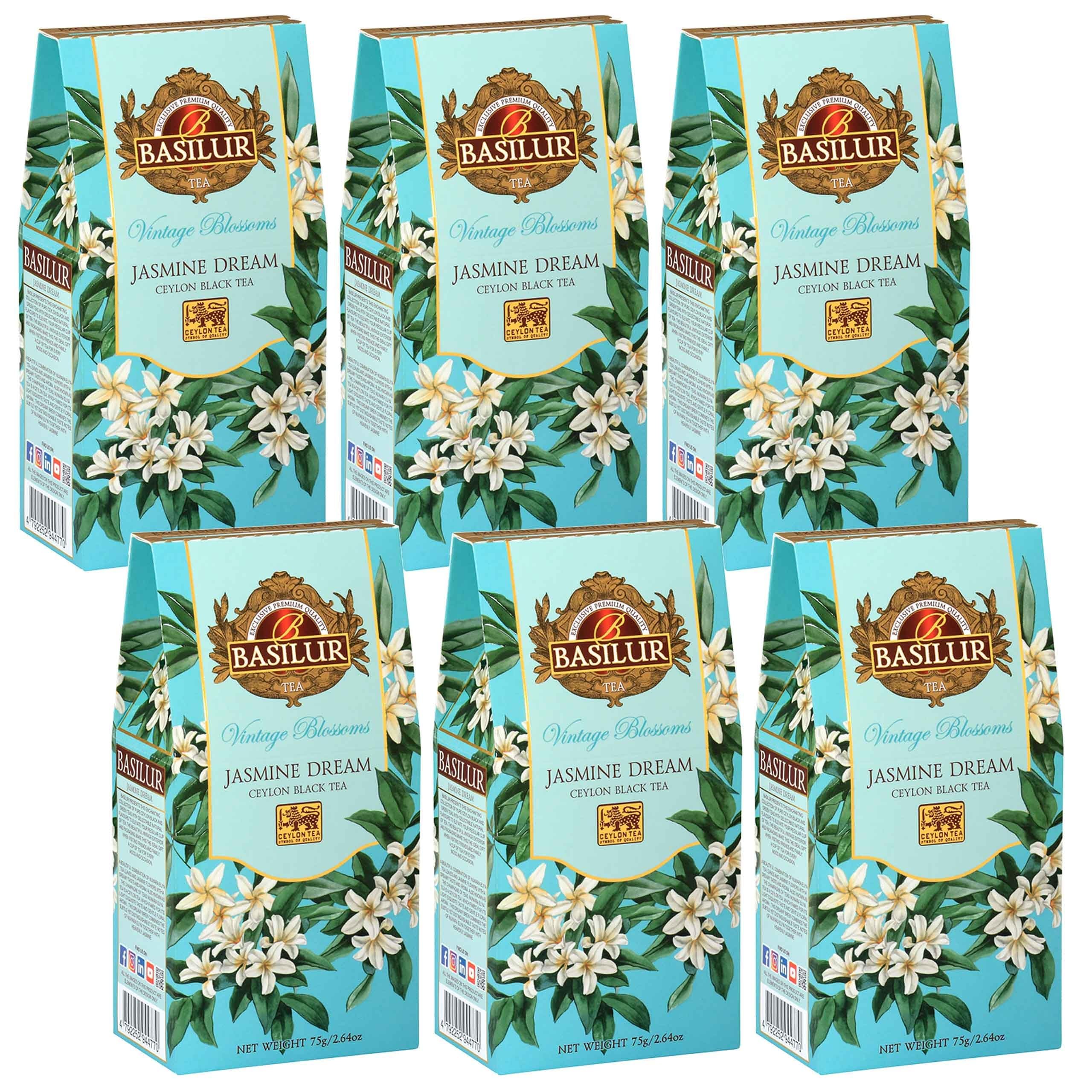 Discover the miraculous power of jasmine! Rich in flavonoids, jasmine flowers have an anti-inflammatory effect and help combat oxidative stress, which also contributes to maintaining beautiful skin. Furthermore, the essential oil extracted from jasmine has a relaxing effect and neutralizes stress. Net weight: 75 g Ingredients: Ceylon black tea (89.7 ) with added jasmine flowers (6 ), cornflower (1.5 ), and natural jasmine flavoring (2.8 ). Country of origin: Sri Lanka International designation of tea quality grade: PEK (Pekoe) - consists of young leaves, contains some long, stiff leaves without tips, and with few holes (perforations). Preparation method: Pour hot water at 95 C over one teaspoon of tea. The steeping time should be between 3 and 5 minutes. Tea can be prepared in two ways: - With a short steep (up to 3 minutes), the infusion will be very refreshing and stimulating. - If you let it steep longer (up to 5 minutes), the infusion will contain less caffeine and have a relaxing effect. A steeping that is too long results in an astringent taste, but it does not increase the caffeine content or increase the stimulation. On the contrary, the tannins produced with each passing minute, which give a bitter taste, neutralize the effect of the caffeine. Black tea leaves are only suitable for a single infusion. Translation performed using the free version of DeepL.com translatorBASILUR VINTAGE BLOSSOMS Jasmine Dream Thé noir aux feuilles avec fleurs de jasmin et bleuet 75 g (x6)DESCRIPTION DU PRODUIT Découvrez le pouvoir miraculeux du jasmin ! Riches en flavonoïdes, les fleurs de jasmin ont un effet anti-inflammatoire et aident à lutter contre le stress oxydatif, ce qui contribue également à maintenir une belle peau. De plus, l'huile essentielle extraite du jasmin a un effet relaxant et neutralise le stress. Poids net : 75 g. Ingrédients : thé noir de Ceylan (89,7 ) avec ajout de fleurs de jasmin (6 ), bleuet (1,5 ) et arôme naturel de jasmin (2,8 ). Pays d'origine : Sri Lanka. Désignation internationale du degré de qualité du thé : PEK (Pekoe) - se compose de jeunes feuilles, contient en partie des feuilles longues et rigides sans pointe (Tips), avec peu de trous (perforations). Méthode de préparation : Versez de l'eau chaude à 95 C sur une cuillère à café de thé. Le temps de perfusion doit être compris entre 3 et 5 minutes. Le thé peut être préparé de deux façons : - Avec une infusion courte (jusqu'à 3 minutes), l'infusion sera très rafraîchissante et stimulante. - Si vous laissez reposer plus longtemps (jusqu'à 5 minutes), l'infusion contiendra moins de caféine et aura un effet relaxant. Une infusion trop longue provoque une astringence dans le goût de l'infusion, mais ne la fait pas contenir plus de caféine et stimuler davantage. Au contraire, les tanins produits à chaque minute qui passe, donnant un goût amer, neutralisent l'effet de la théine. Les feuilles de thé noir ne conviennent que pour une seule infusion. Traduction réalisée avec la version gratuite du traducteur DeepL.com