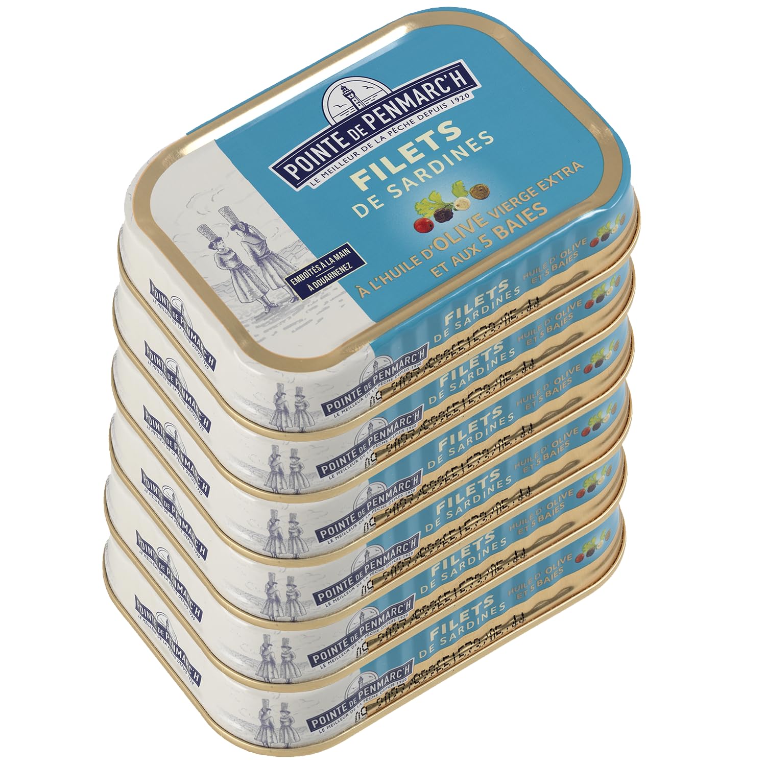 INGREDIENTS SARDINE fillets (Sardina pilchardus), extra virgin olive oil, 5 berry mix (black, white and green peppercorns, pink peppercorns and coriander in varying proportions) 2 , salt. Caught in the Northeast Atlantic Ocean.Rich in: Omega 3. Responsibly sourced. Hand-packed in Douarnenez. Free delivery on orders over €80 from our entire store. INGRÉDIENTS Filets de SARDINES (Sardina pilchardus), huile d'olive vierge extra, mélange 5 baies (poivres noir, blanc et vert, baies roses et coriandre en proportions variables) 2 , sel. Pêchées en Océan Atlantique Nord Est.Riche en : Oméga 3. Pêche responsable. Emboîtées à la main à Douarnenez. Livraison offerte dès 80€ d'achat sur toute notre boutique .