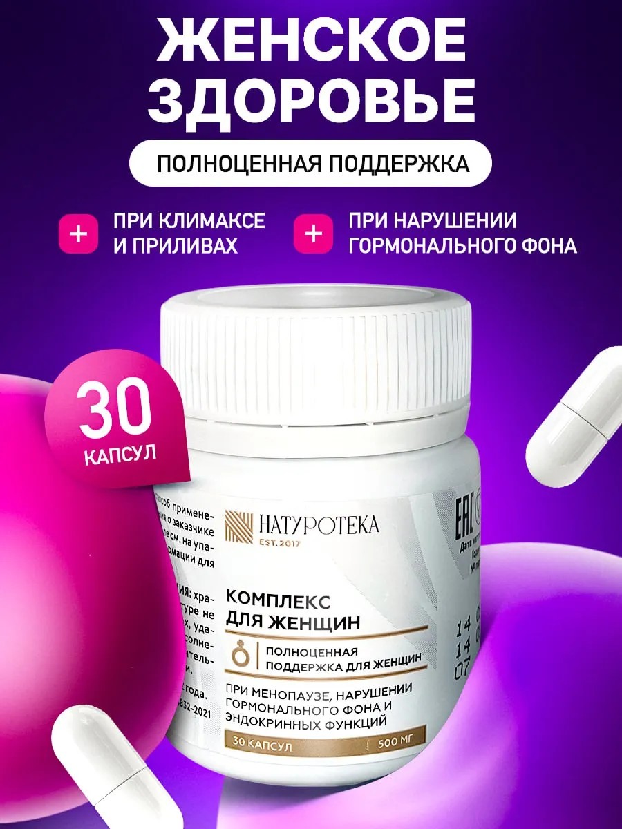 Натуральный, негормональный комплекс натуротека для женщин в период менопаузы или раннего климакса от компании сашера мед Витаминный комплекс Naturoteka в капсулах устраняет климактерический синдром или климакс у женщин. Биогенный комплекс восстанавливает гормональный баланс организма, укрепляет сосудистую стенку капилляров, улучшая таким образом капиллярное кровообращение и питание тканей, способствует регулированию баланса эстрогенов Капсулы для здоровья избавляют от следующих проявлений: повышенная реактивность, раздражительность, плаксивость, депрессивные состояния, приливы, потливость, сухость влагалища в период угасания репродуктивной функции. Бад для женщин при климаксе способствует улучшению обмена веществ. Нормализует состояние нервной системы. Повышает умственную деятельность. Увеличивает работоспособность. Устраняет климактерический синдром. Ускоряет метаболизм (способствует сохранению фигуры в период менопаузы). Витамины для женщин 45 плюс укрепляют иммунитет, восстанавливают артериальное давление. Предупреждают преждевременное старение, от выпадения волос, для здоровых ногтей и кожи. Комплекс оказывает дополнительное действие и способствует: устранению витилиго, устранению слабости мышц мочевого пузыря. Таблетки от климакса предупреждают опущение органов в результате возрастного и эндокринного факторов, улучшают сердечно-сосудистую деятельность. Биологически активный комплекс для женщин регулирует минеральный баланс, предупреждает выведение кальция и симптомов остеопороза, восстанавливает плотность костной ткани. Отличное дополнения к продукции сустарад сусталь сашель. Хорошим дополнением будет добавить к курсу морской коллаген, витамин д3 в6 в12 креатин омегу магния цитрат кератин калий биотин и фолиевую кислоту. Подарок со скидкой для мамы бабушки любимой подруги или коллеги. Спортивное питание для снижения веса. Действие экстрактов лекарственных растений входящих в состав пищевой добавки усилено витаминами группы В, магний, селен, E, D3.