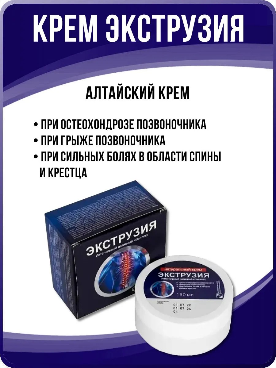 Натуральная органическая крем - мазь Экструзия для позвоночника, спины и поясницы интенсивного проникающего действия на основе нативных остеобластных и хондроцитных клеток пантов алтайского марала, обогащенный млечным соком лекарственных растений от компании Сашера Мед, созданный на Алтае. При остеохондрозе позвоночника сильных болях в области спины и крестца шейном остеохондрозе защемлении протрузиях, грыжах болях в суставах ревматических артритах артрозе потере функций опорно-двигательного аппарат растяжении ушибах травмах в мышцах ночных спазмах воспалительных процессах слизистых сумок невритах нарушении кровообращения подвижности конечностей онемении пальцев переломах костей рубцах и операционных швах спондилите подагре флебите и тромбофлебите поверхностных вен Оказывает противовоспалительное болеутоляющее ранозаживляющее регенерирующее восстанавливающее против инфекционное действие Экструзия – натуральный органический крем при грыже поясничного отдела Это обезболивающая мазь которую можно использовать как крем для тела или гель для рук и ног спины и поясницы. Мазь от боли в спине оказывает ранозаживляющее, регенерирующее, восстанавливающее, против инфекционное действие помогает улучшить работу суставов, позвоночных сегментов, а также снять острый болевой синдром. Гель для спины Экструзия обладает глубоким проникновением через клетки эпидермиса к области разрушения хрящевой ткани и способствует регенеративным процессами хрящевой ткани и эпифизов костей, Рекомендуется использовать не менее 2 раз в день Курс приёма 10 дней Возможно использование средства без ограничений подойдет для взрослых женщин и мужчин, парней и девушек, подросткам станет отличным подарком для близкого человека: мужа или жены, мамы или папы, брата или сестры, сына или дочери, подруги друга или коллеги на Новый год Рождество 8 Марта 23 Февраля День святого Валентина или день рождения. У нас есть акции и распродажи, вы можете купить наши товары в подарок со скидкой.150 50 100 мл