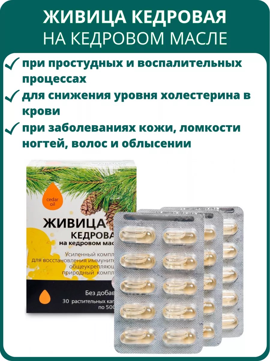 Живица кедровая на кедровом масле без добавок, капсулы 30 шт. При простуде, авитаминозе, ОРВИ, инфекциях, для иммунитета. Живица кедровая на кедровом масле – 100% природный комплекс на основе масла кедрового и живицы кедра.