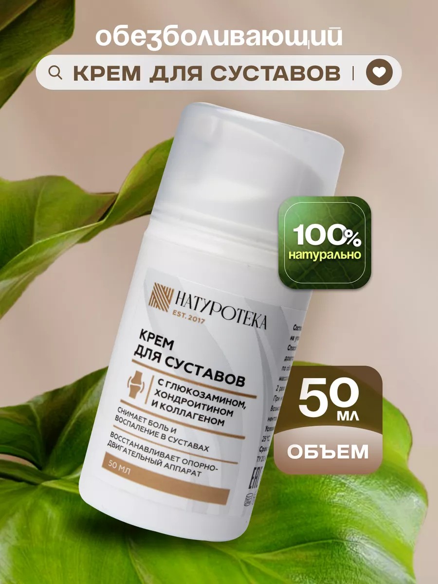 Органический натуральный обезболивающий крем Натуротека для суставов на основе комплекса природных источников хондроитина, глюкозамина и коллагена, направлен на устранение изменений функций и состояния хрящевой ткани, соединительных, мышечных и нервных волокон опорно-двигательного аппарата. Быстро впитывается в кожу и оказывает мгновенное облегчение, снимая боль и усталость. Помогает против артрита, артроза и остеохондроза. Крем для суставов убирает отеки, гематомы и болевые ощущения в пояснице, выводит скопленную жидкость. Подойдет для спортсменов, снимает боль от растяжений. Гель мазь улучшает обменные процессы и способствует усилению кровообращения к проблемным участкам костно-мышечной системы. Устраняет гнойно воспалительные и инфекционные процессы. Восстанавливает подвижность. Гипоаллергенный. Способ применения: крем в количестве 2-3 нажатий на дозатор нанести на болевую часть, распределить по воспалению и прилегающей области лёгкими массажными движениями. Применять 2 раза в день. Курс — 30 дней. При необходимости повторить через месяц. Возможна индивидуальная непереносимость компонентов.