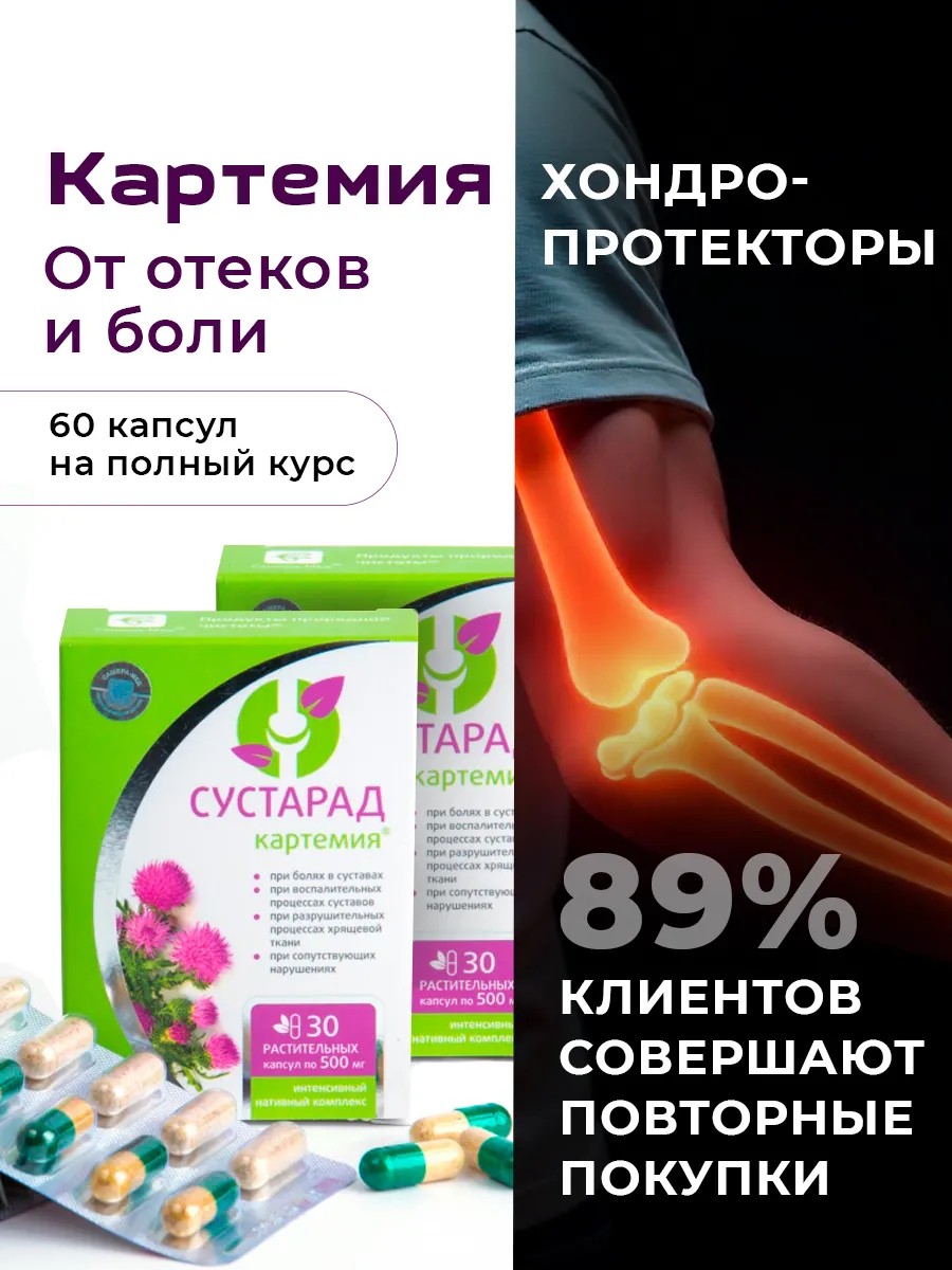 Картемия сустарад от компании сашера мед - это инновационный биокомплекс в капсулах для укрепления и защиты суставов, связок и сухожилий. Натуральный состав препарата обеспечивает полное комплексное воздействие - снижает боли и воспаление, увеличивает подвижность, убирает скованность, способствует восстановлению хрящей и усиливает сопротивляемость суставов к физическим нагрузкам. Ключевыми элементами алтайского средства являются экстракты каремии, сабельника, гинкго билоба и панты марала. Эти ингредиенты известны своими сильными противовоспалительными, противоинфекционными и восстановительными свойствами.