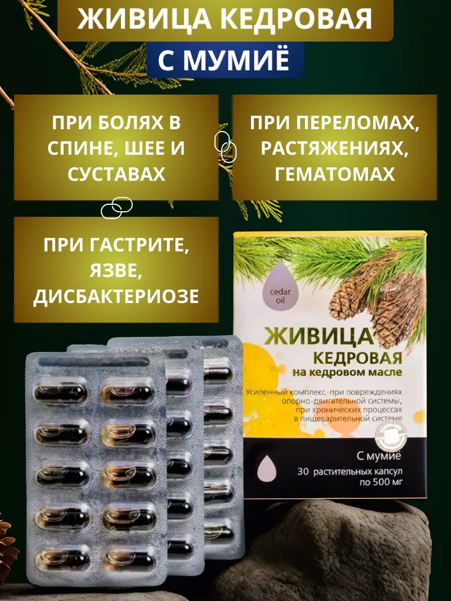 Живица кедровая с мумиё при повреждениях опорно-двигательной системы, капсулы 30 шт. При болях в спине и суставах, дерматите.