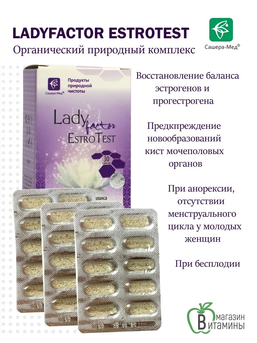 LadyFactor Estrotest – органический природный комплекс на основе фармакор растений с высоким содержанием фитостеринов, обогащённый эссенциальными нативными витаминами и минералами, направленный на регуляцию функций фолликулярного аппарата яичников у женщин, восстановление уровня эстрадиола и баланса половых гормонов.Биогенный комплекс не содержит гормонов, лекарственных, генномодифицированных веществ, консервантов, оказывает действие на естественные процессы синтеза эстрадиола и прогестерона в организме женщины, рекомендован:при снижении продукции эстрогенов в возрасте от 18 до 50 лет в результате неблагоприятных экзогенных и эндогенных факторов;при нарушении баланса прогестерона, эстрогенов и патологических процессах молочных желёз, эндометрия, яичников;для предупреждения новообразований, кист мочеполовых органов;при анорексии, отсутствии менструального цикла у молодых женщин в результате гормонального, стрессового, лиматического и других факторов;для восстановления менструального цикла при эпизодическом или хроническом отсутствии; при увеличении массы тела в результате снижения продукции эстрогенов;при бесплодии;при головных болях;при высыпаниях на коже;при снижении тонуса слизистых половых органов;при отставании в физическом и половом развитии у девочек в пубертатном периоде;при резорбции костной ткани (разрушении) в результате сниженного эстрогенового фона;при снижении иммунных функций;для предупреждения нарушений эндометрия;при диффузных нарушениях в тканях молочных желёз;при слабом развитии вторичных половых признаков (при нарушении психоэмоционального состояния, неврозах, раздражительности);при самопроизвольном мочеиспускании при смехе, чихании и т.д.;при истончении кожи, преждевременных морщинках у женщин молодого и среднего возраста. Органический комплекс обладает дополнительным регулирующим действием на функции и состояние сердечно-сосудистой, иммунной, эндокринной, пищеварительной, мочеполовой, нервной систем, обеспечивает: саморегуляцию баланса липопротеидов высокой и низкой плотности и предупреждение повышения уровня холестерина высокой плотности в крови;регуляцию тонуса сосудов сердца и головного мозга, предупреждение атеросклеротических нарушений;нормализацию либидо при его снижении у женщин в результате возрастного, иммунного, эндокринного факторов;нормализацию психоэмоционального баланса;регуляцию артериального давления, сердечного ритма;регуляцию чувствительности клеток к инсулину и предупреждение развития резистентности и повышения уровня глюкозы в крови;поддержание эластиногенеза и коллагеногенеза, тонуса и упругости кожи;нормализацию тонуса мышечной и соединительной ткани, предупреждение дистрофии. Способ применения: рекомендуется принимать по 1 таблетке 2 раза в день за 30 мин до еды на голодный желудок. Курс – 30 дней. Для поддержания гормонального фона и предупреждения возрастных изменений мочеполовых органов рекомендуется 4 курса в год.