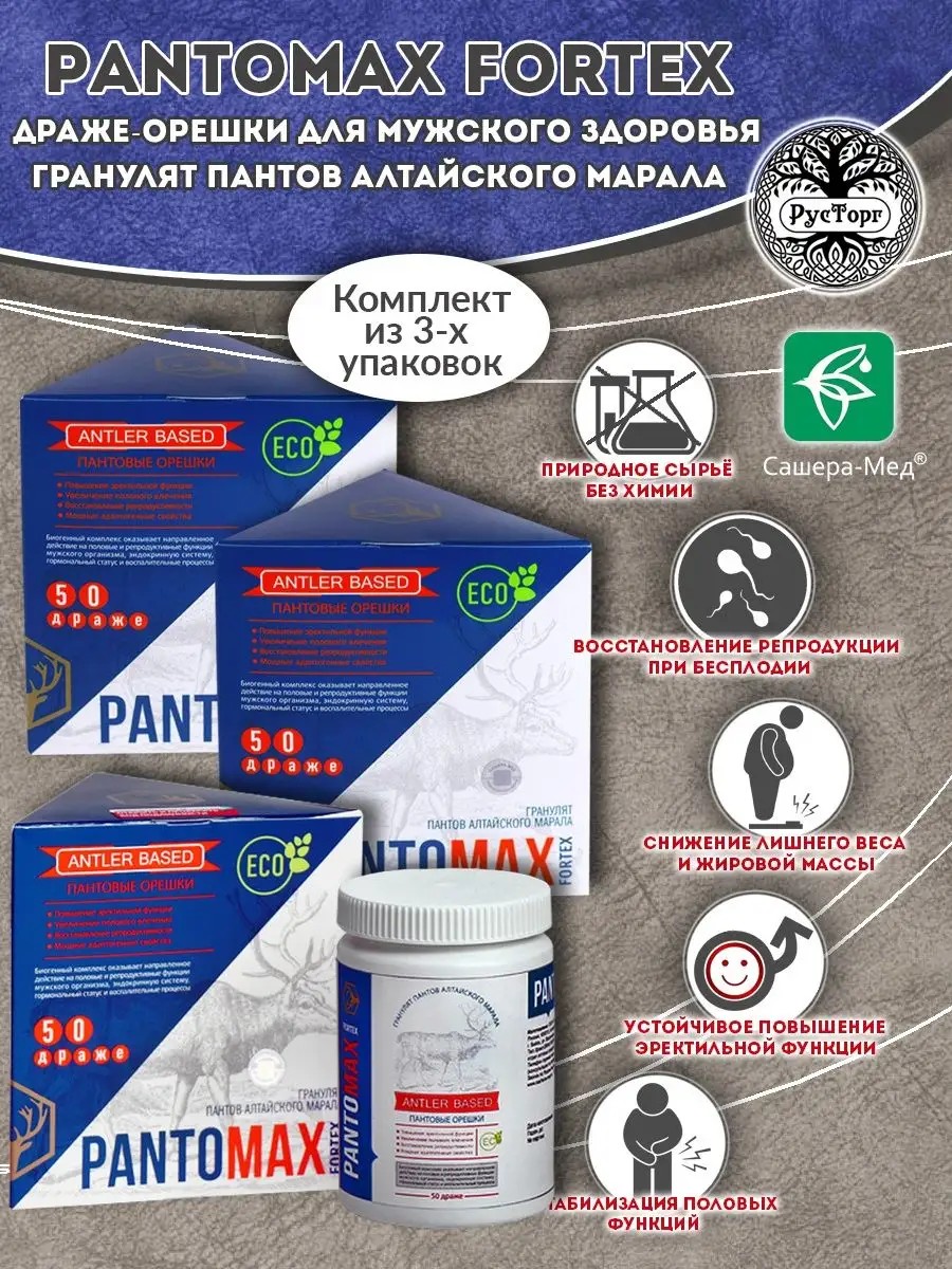 PANTOMAX Fortex (Пантомакс Фортекс) это биогенный продукт на основе гранулята пантов алтайского марала, обогащённый микросферами концентратов активных структур растений и природных компонентов, направленный на регуляцию функций и состояния органов мочеполовой, эндокринной, нервной системы мужчин, нормализацию эректильной функции, восстановление биохимического равновесия синтеза гормонов и функций органов репродуктивной системы.Основные действия биогенного комплекса:устойчивое повышение эректильной функции; повышение полового влечения; стабилизация половых функций мужского организма; устранение эректильной дисфункции; восстановление функции репродукции при бесплодии; улучшение подвижности эякулята; нормализация синтеза тестостерона, регуляция гормонального фона; устранение воспалительного процесса предстательной железы и мочевой системы; устранение гиперплазии предстательной железы; повышение физической выносливости; повышение умственной активности; быстрое восстановление после физических и психоэмоциональных нагрузок; снижение веса и лишней жировой массы; коррекция рельефа фигуры, устранение складок и обвисаний; устранение бессонницы, подавленности, депрессии; оказание мощного адаптогенного действия.Дополнительные действия биогенного комплекса:нормализация давления;улучшение мозгового кровообращения, предотвращение гипоксии, повышение памяти и умственной активности; устранение атеросклеротических изменений сосудов; регуляция сердечного ритма; восстановление зрения; устранение возрастных изменений, повышение общего тонуса организма, омоложение, увеличение популяции здоровых молодых клеток органов и тканей; нормализация обменных процессов; предотвращение воспалительного процесса поджелудочной железы; устранение атрофии пищеварительных органов; обеспечение поступления биоактивной формы белков, жирорастворимых витаминов к органам и тканям; устранение изменений нейропроцессов (Паркинсона, Альцгеймера); предупреждение изменений костной ткани и суставов; устранение хронических воспалительных процессов; устранение грибковых процессов; нормализация состояния кожи, восстановление защитных функций кожи; устранение алопеции; повышение иммунного ответа организма на внешние и внутренние неблагоприятные факторы; восстановление организма после операционных вмешательств и травм; повышение регенерации повреждённых тканей; ускорение регенерации костной ткани при переломах; снижение токсического действия алкоголя на организм; нормализация состава крови; проявление активности в отношении вируса туба; положительное действие при герпесвирусной инфекции, венерических процессах; положительное действие при онкопроцессах.Способ применения: принимать по 1 орешку за 30 мин до еды 3 раза в день, разжёвывая и запивая водой. Курс – 21 день. Продукт не рекомендуется детям до 16 лет. Возможен приём в подростковом возрасте с 14 лет при отставании в половом, физическом или умственном развитии – по 1 орешку 1 раз в день за 30 мин до еды в первой половине дня.