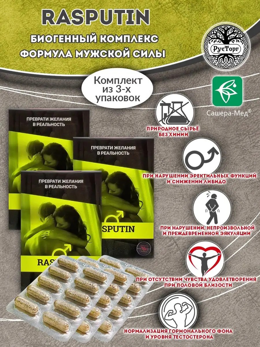 Капсулы Распутин, мужская - сила это высокоэффективные капсулы, предназначенные для экстренного восстановления потенции. Средство состоит исключительно из растительных компонентов и не имеет химических соединений. Биогенный полиактивный продукт содержит комплекс биоактивных компонентов в усваиваемой биодоступной форме, полностью растворимой в клеточных жидкостях, оказывает комплексное восстановительное и регулирующее действие: при нарушении эрекции, при снижении либидо, при нарушении эякуляции. Состав: нативные концентраты пантов алтайского марала, жгун-корня Моннье, красного корня, якорцев стелющихся, эврикомы длиннолистной, гинкго билоба, клевера, семян лимонника китайского, эпидемиума, эспарцета, мускатного ореха, любистка, весёлки обыкновенной, гриба рейши, девясила, пчелиного подмора, лапчатки гусиной, леспедецы копеечниковой, уснеи бородатой. Курс -4 недели. Возможна индивидуальная непереносимость компонентов продукта. Естественные компоненты природного комплекса обладают дополнительным многоплановым регулирующим действием на функции и состояние эндокринной, сердечно-сосудистой, нервной, иммунной, мочеполовой, пищеварительной систем. Биоактивная формула RASPUTIN рекомендована в любом возрасте при снижении половой активности или полной дисфункции полового органа, т.к. оказывает индивидуальное регулирующее действие на причины возникновения эректильной дисфункции психогенного, эндокринного, урологического, нервного, иммунного характера. Распутин в растительных капсулах обеспечивает сохранение биоактивности природного комплекса в период срока годности, не содержит искусственных, лекарственных, генномодифицированных, психогенных веществ, гормонов, консервантов, не вызывает привыкания, не нарушает зрительных, моторных функций, памяти, внимания, естественного баланса гормонального фона и иммунных реакций. Возможно применение для предупреждения эректильной дисфункции при повышенных физических и психологических нагрузках, нарушении уровня сахара в крови, при возрастных изменениях функций и состояния органов репродуктивной системы и хронических процессах возрастного характера, являющихся причиной импотенции. Биогенная формула комплекса обладает дополнительным антиоксидантным, омолаживающим, регенерирующим действием, способствует восстановлению сил после травм, тяжёлых заболеваний, хирургических вмешательств. Натуральная формула RASPUTIN обладает накопительным ступенчатым действием: корректирует причину эректильной дисфункции; восстанавливает половые возможности; устраняет гормональный дисбаланс; восстанавливает равновесие половых функций и состояние органов эндокринной, сердечно-сосудистой, пищеварительной, мочевой, нервной, иммунной систем; нормализует гормональный фон; нормализует состояние поджелудочной железы и чувствительность клеток к инсулину; повышает иммунный ответ на внешние и внутренние неблагоприятные факторы.