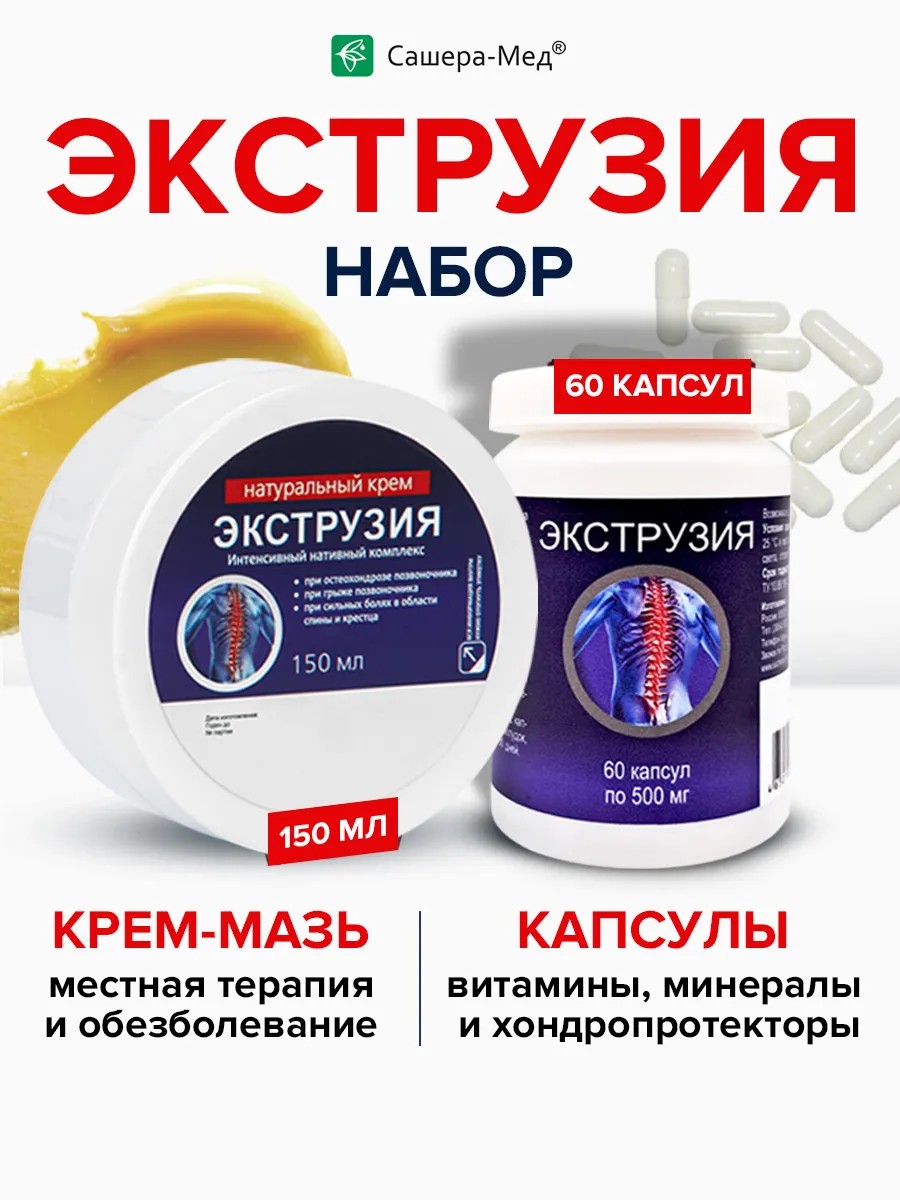 Набор экструзия от сашера мед для комплексной поддержки здоровья позвоночника и суставов включает в себя капсулы и крем. Такой подход воздействия снаружи и изнутри помогает намного быстрее и результативнее справиться с болью, воспалением и дегенеративными изменениями межпозвоночных дисков и хрящевой ткани. В состав натуральных капсул и крема входят хондропротекторы - порошок пантов алтайского марала, глюкозамина гидрохлорид, хондроитина сульфат, морской коллаген, а также экстракты полезных трав, включая сабельник, гингко-билобу, витамины и минералы. Природный комплекс оказывает противовоспалительное, болеутоляющее, восстанавливающее и противоинфекционное действие. Алтайские растительные средства подходят людям всех возрастов, кто хочет сохранить здоровье спины - позвоночника и поясницы, хрящей и суставов, и не допустить таких серьезных проблем, как грыжи, экструзии и протрузии.