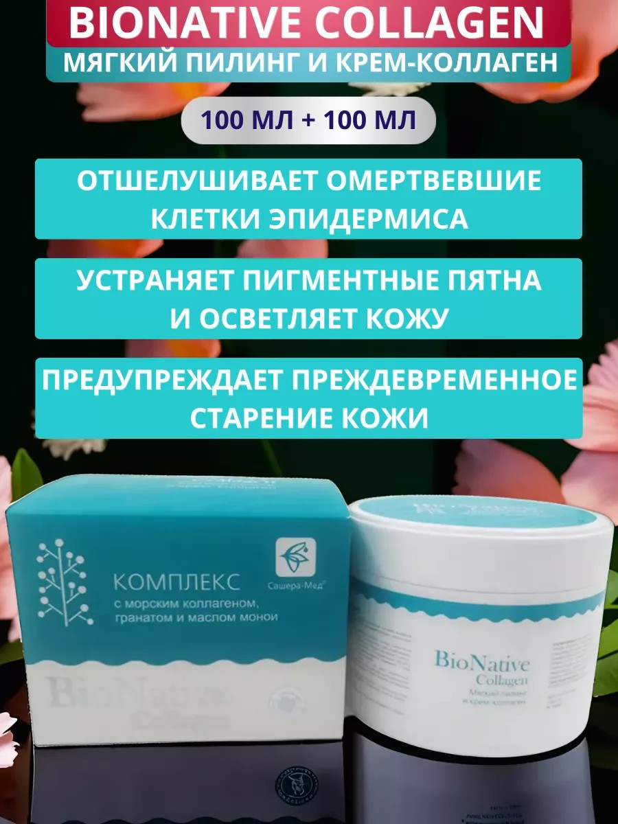 BioNative Collagen коллагеновый бустер-комплекс. Мягкий пилинг 100 мл + крем-коллаген 100 мл, от пигментных пятен, морщин