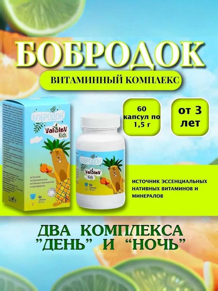 Витаминный комплекс Бобродок ValulaV Kids – органический комплекс на основе нативных источников эссенциальных витаминов и минералов в биодоступной усваиваемой форме, разработанный специально для детей с 3 лет для восполнения витаминно-минерального депо организма, регуляции обменных, иммунных процессов, предупреждения авитаминозных состояний.Эссенциальная формула Бобродок Kids содержит два комплекса – «День» и «Ночь», разделённые на таблетки разного цвета, которые включают необходимые для нормального развития нативные витамины и минералы, разработана с учётом особенностей развития и состояния иммунной, эндокринной, пищеварительной, нервной, костно-мышечной, сердечно-сосудистой систем у детей с 3 лет. Витаминный комплекс Бобродок Валулав