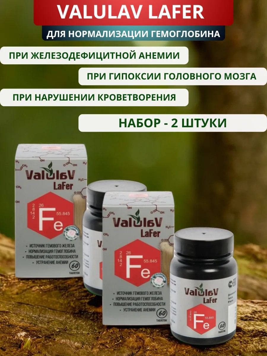ValulaV LaFer для нормализации гемоглобина, 60 таблеток - набор 2 шт.. При железодефицитной анемии, нарушении кроветворения. Valulav LaFer (ЛяФер) – органический комплекс на основе эссенциальной формулы нативных источников гемового железа в биодоступной усваиваемой форме, обогащённой нативным витамином С для улучшения усвоения микроэлемента железа. Биогенная формула Валулав ЛяФер в одной таблетке содержит 15 мг элементарного железа, что на 100% удовлетворяет адекватным суточным нормам потребления железа.Нативная формула не содержит искусственных, генномодифицированных веществ, гормонов, консервантов, не вызывает привыкания, не нарушает моторные функции кишечника, не вызывает констипацию (запоры).