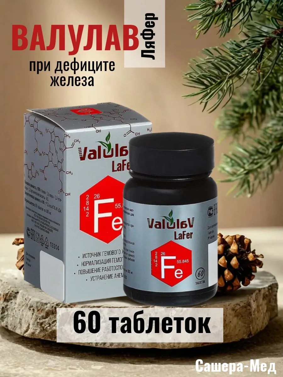 Valulav LaFer (ЛяФер) – органический комплекс на основе эссенциальной формулы нативных источников гемового микроэлемента железа в биодоступной усваиваемой форме, обогащённой нативным витамином С для улучшения усвоения микроэлемента железа.Форма выпуска: 60 таблеток по 300 мг