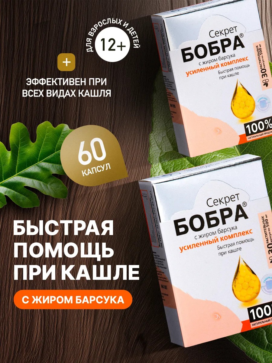 Секрет бобра с жиром барсука в капсулах от компании Сашера-Мед. Быстрая помощь при кашле — это гармоничное сочетание природных компонентов из самого сердца Алтая – уникального секрета «бобровая струя» (мускус, кастореум) железы речного бобра, барсучьего жира и перги пчелиной; обладает мощным лечебно-профилактическим действием, направленным на эффективное улучшение состояния при сильном кашле, трахеитах, бронхитах, бронхопневмонии, некоторых видах астмы. Барсучий жир – интенсивное средство для быстрой и эффективной помощи при кашле различного происхождения, включая кашель курильщика, трахеитах, бронхитах, бронхопневмонии. Эффективный как и Бобродок. Барсучий жир обладает общеукрепляющим, противовоспалительным, иммуностимулирующим и антиатерогенным действием, ускоряет процессы восстановления тканей. Кашель доставляет много неприятных моментов, т.к. возникают постоянные позывы прочистить дыхательные пути, но отхождения мокрот не происходит и они только травмируются. Капсулы с жиром барсука направлены на успокоение кашлевого центра и на то, чтобы помочь ему трансформироваться во влажный, при котором слизь легко выводится наружу. Эффективность барсучьего жира в устранении патологических процессов в слизистой бронхов, скопившейся слизи, вызывающей судорожные приступы кашля. Капсулы обладают быстрой усвояемостью; природное средство облегчает состояние при простуде, гриппе, ОРВИ, ОРЗ, бронхите, пневмонии, фарингите, ларингите, трахеите, стоматите; обладает противовоспалительным, болеутоляющим действиями, положительно влияет на бронхолегочную систему, уничтожает вирусы и болезнетворные бактерии, стимулирует иммунную систему. Капсулы от кашля для взрослых эффективны при инфицировании вирусами дыхательных путей; быстро устраняет сухой и влажный кашель, даже очень сильный (противокашлевое и бронхолитическое действие). Капсулы от кашля содержат в себе уникальный сбалансированный состав из натуральных витаминов и микроэлементов для детей, который не заменит ни один препарат. Так же секрет бобра рекомендуется в качестве дополнительного источника ПНЖК, Омега 3 и Омега 6, витамина А и витамина Е Отличный подарок для самых близких! Для мамы бабушки, для малыша, для детей. Подходит от простуды детям. сок пихты сибирской, комплекс натуральных витаминов, лечение ЖКТ, пихтовый хлорофилл, жидкий противовирусный препарат для иммунитета, средство от простуды, от кашля, сибирское здоровье. Комплекс для укрепления иммунитета взрослым и детям. Здоровое и правильное питание. Чай, сбор, бальзам для иммунитета. Средство от простуды снимает раздражение в горле, уменьшают кашель и делают ваше состояние более комфортным во время болезни. Это не только средство для лечения симптомов простуды, но и мощный иммуномодулятор.Коклюш пневмония Отхаркивающее средство разжижение мокроты Мукалтин исландский мох корень солодки микстура от кашля Если вы хотите избежать простуды, симптомов простудных заболеваний, гриппа и сопутствующих им проблем, он станет вашим надежным помощником.