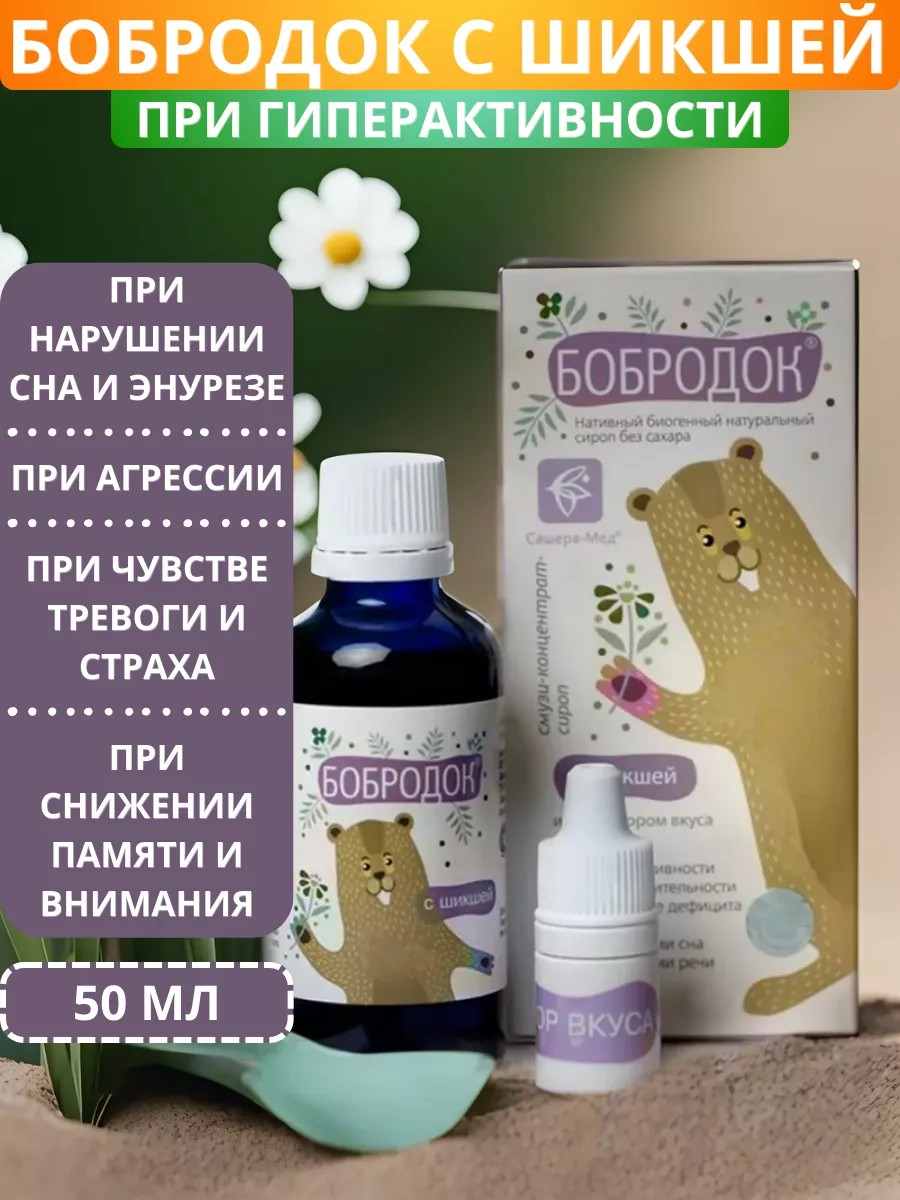 Бобродок с шикшей – натуральный сироп без сахара полиактивного действия, разработанный с учётом особенностей функций нервной системы детей, возможных причин гиперактивности и неврологически-поведенческого расстройства наследственного, нервного, психотравматического, инфекционного факторов.