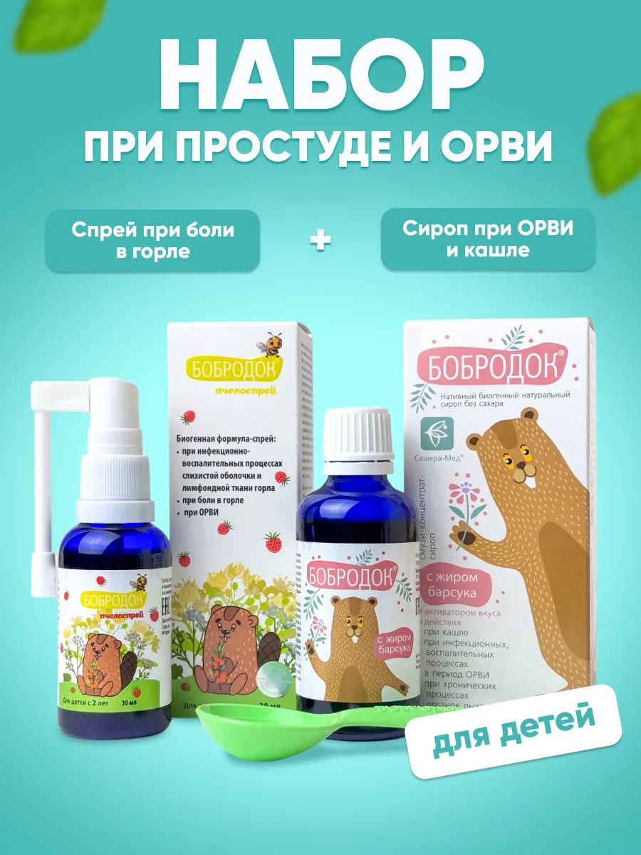 Эффективный и полностью натуральный комплекс от гриппа и простуды для детей. Комплекс состоит сиропа Бобродок с жиром барсука и спрея для горла с прополисом.