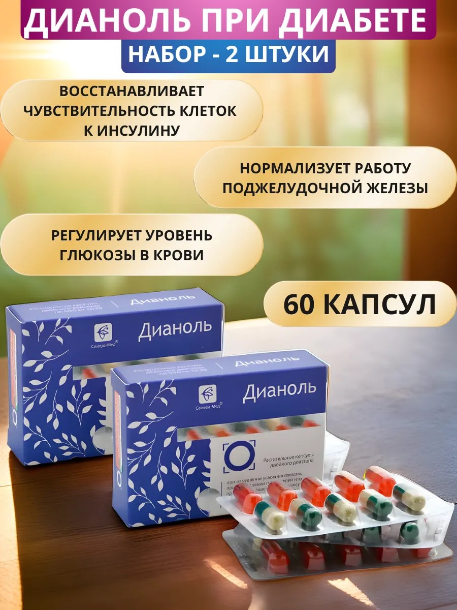Дианоль при сахарном диабете, 30 капсул - набор 2 штуки. Для поджелудочной железы, при гипергликемии, для регуляции уровня глюкозы в крови.