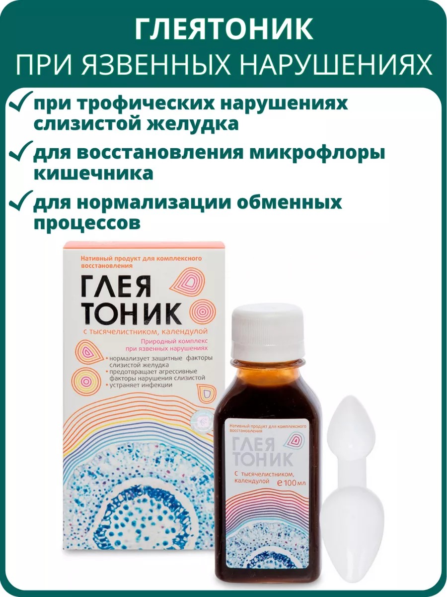 Natural complex for ulcerative disorders Gleyatonic with yarrow and calendula is a native product based on a biological complex of zoogloea and eco-extracts from medicinal plants, which helps eliminate local defects of the gastric and duodenal mucosa and trophic disorders in the area of the defect.