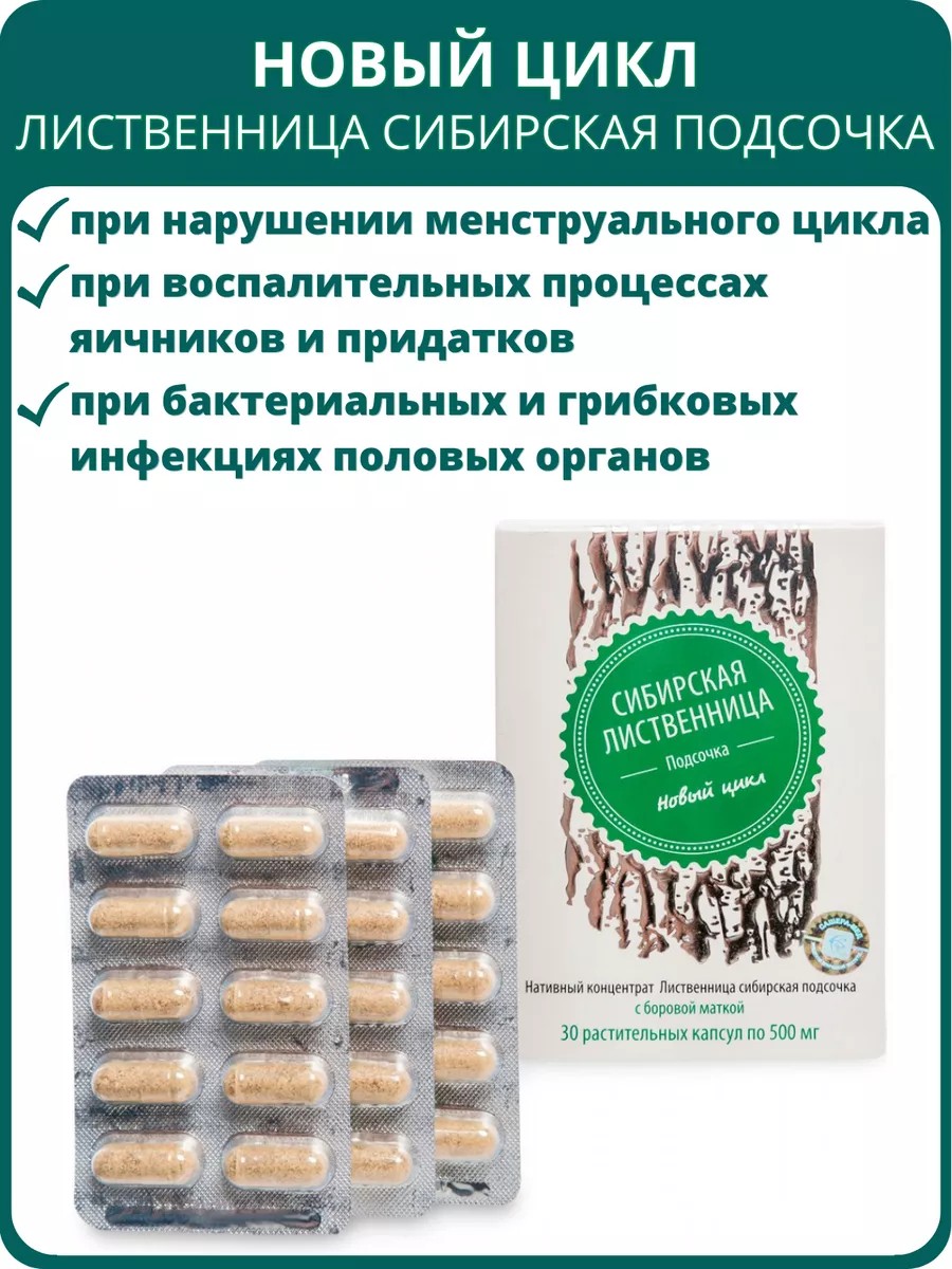 Лиственница сибирская подсочка Новый цикл, 30 капсул. При болях в период менструации, мастопатии, воспалении яичников, придатков.
