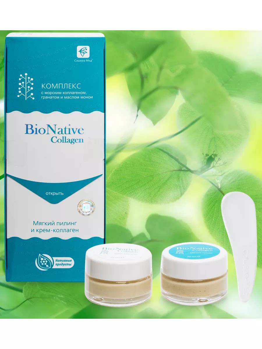 Bionative Collagen мягкий пилинг 20 мл и крем-коллаген 20 мл. Коллагеновый комплекс является нативным природным средством, не содержит искусственных, генномодифицированных, лекарственных веществ, гормонов, токсинов, нефтепродуктов, консервантов, не вызывает привыкания. Гипоаллергенно.