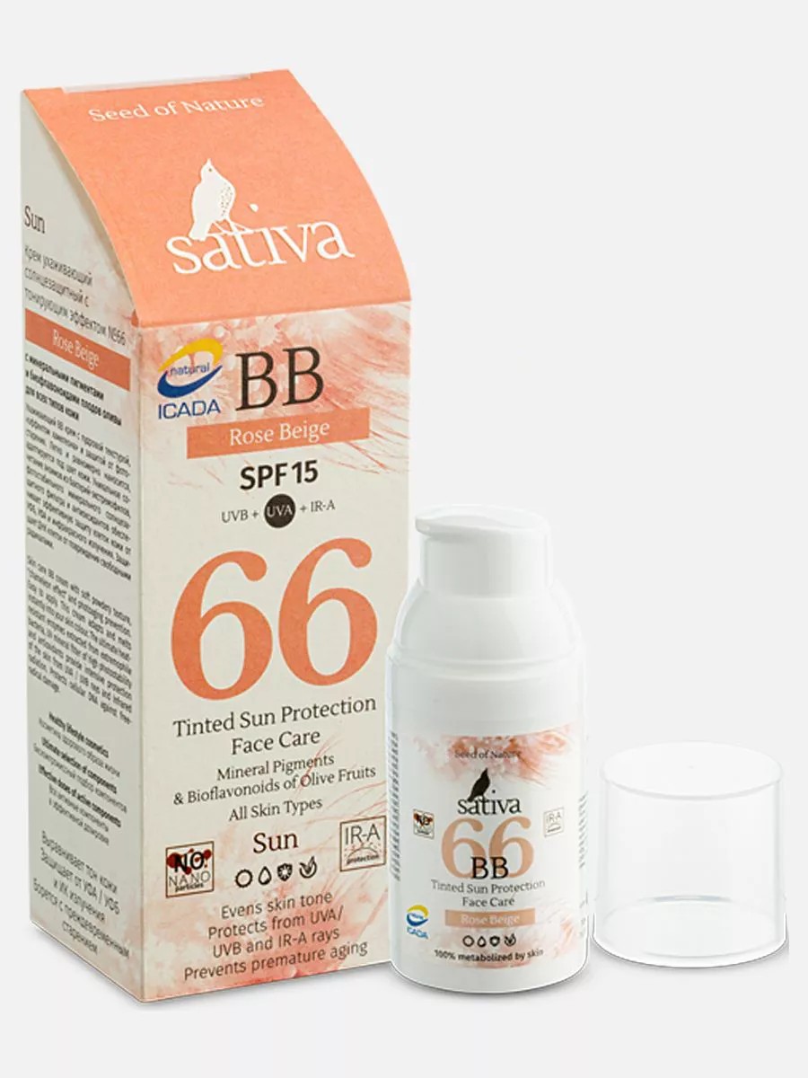 Солнцезащитный крем с тонирующим эффектом SATIVA № 66 Rose Beige. SPF 15. Розовый подтон. Для всех типов кожи. C минеральными пигментами и биофлавоноидами плодов оливы белорусского бренда.