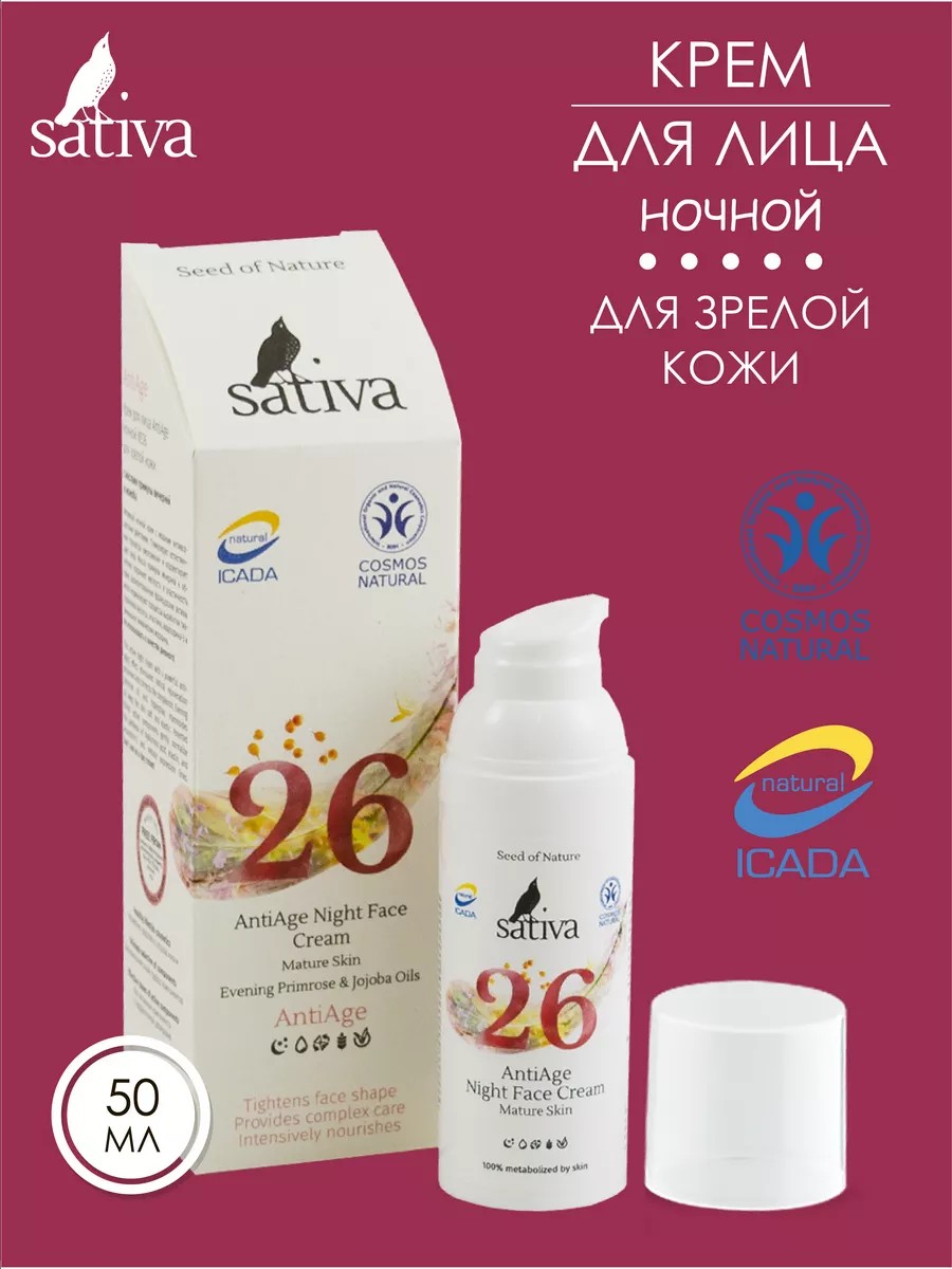 Ночной крем для лица Sativa №26 с мощным антивозрастным AntiAge действием. Увлажняющий женский крем с омолаживающим эффектом против морщин для зрелой кожи. Наносите питательный крем за 20-30 минут до сна по массажным линиям.