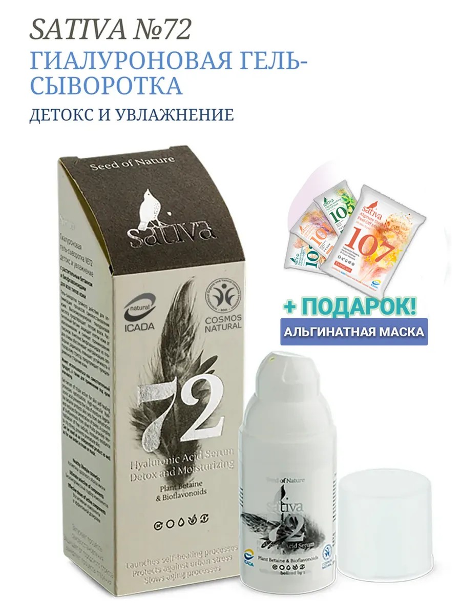 Гель-сыворотка для лица Sativа №72 с высокомолекулярной гиалуроновой кислотой, растительным бетаином и биофлавоноидами. Подарок в комплекте! Увлажняющая сыворотка для лица тройного действия для оптимизации процессов самовосстановления кожи. Подходит для возраста 25, 30, 35+ и 45 плюс. Подходит как уход за телом - для зон шеи и декольте.