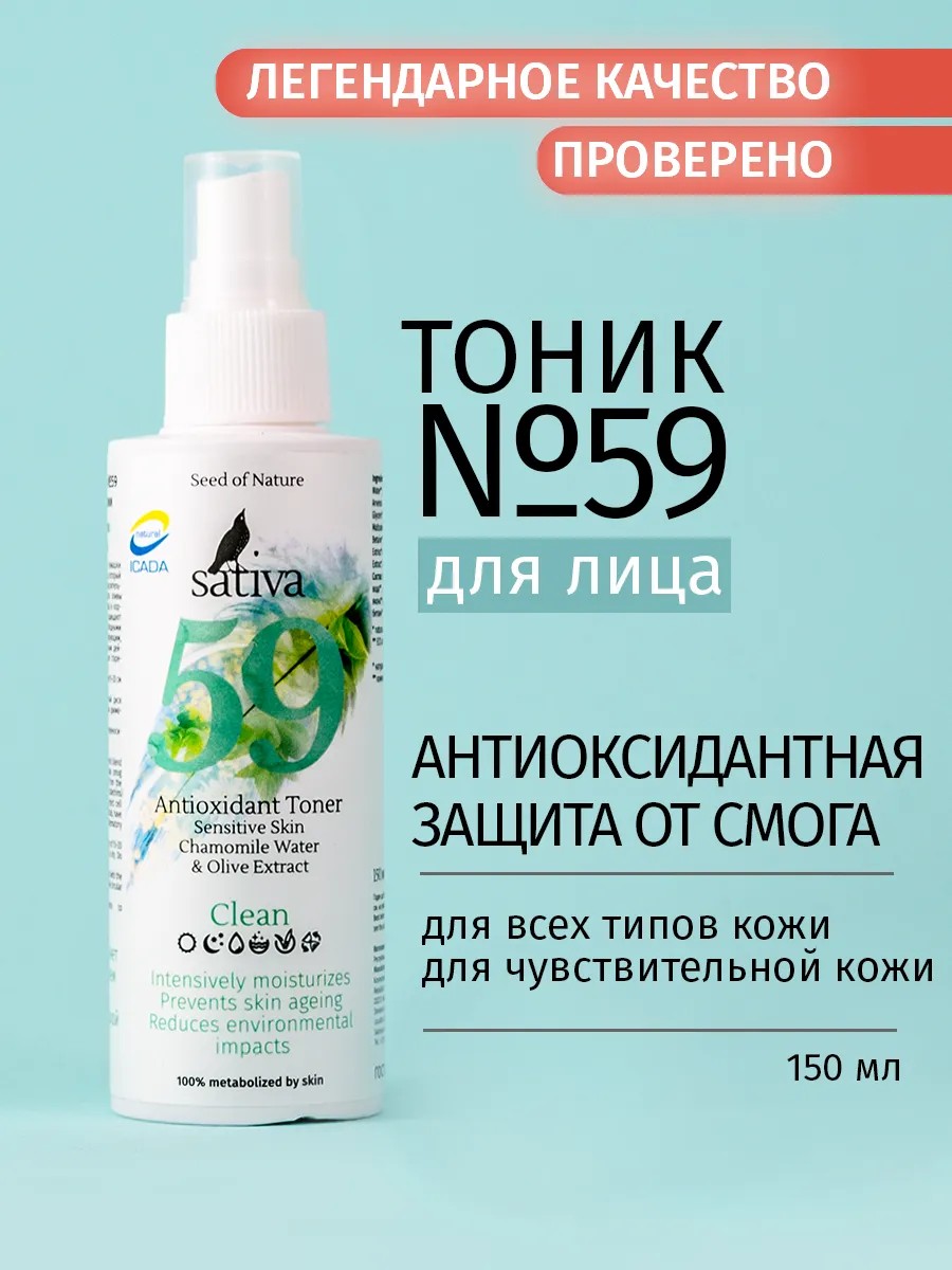 Sativa Тоник для лица антиоксидантный №59 – это тоник с сильным антиоксидантным комплексом, который защищает кожу от городского смога и окислительного стресса. 2-3 нажатия на распылитель мгновенно возвращает нормальный рН кожи 5-5,5 и защищает кожу от воздействия агрессивных химических веществ. Подходит для всех типов кожи, для чувствительной кожи. Тоник снимает следы усталости, уменьшает воспаления и покраснения, препятствует образованию комедонов, улучшает цвет лица. Не оставляет ощущения плёнки на лице.