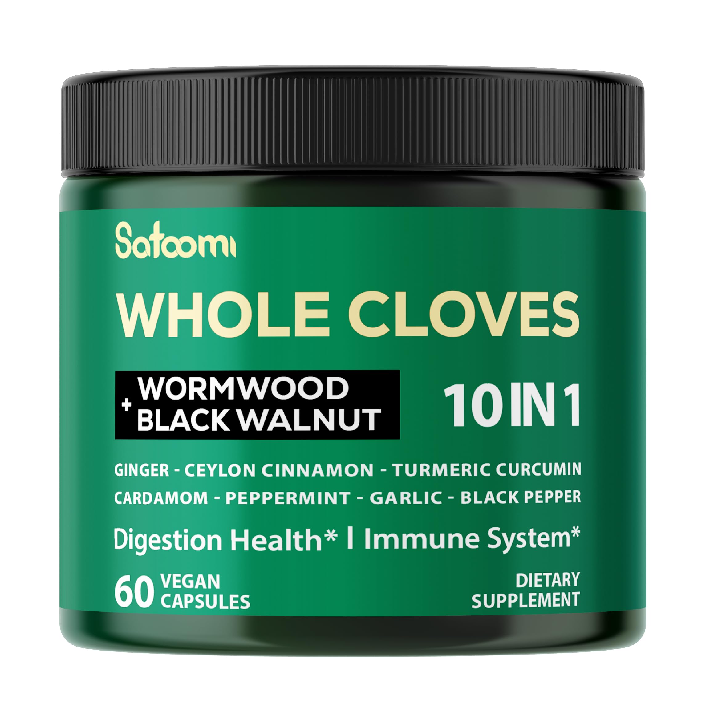 Satoomi 10in1 Clove Supplement Rich in Vitamins & Minerals for Digestive, Immune System, Bone & Heart Health with Wormwood, Black Walnut, Cinnamon, Turmeric, Ginger, Cardamom - 60 Capsules
