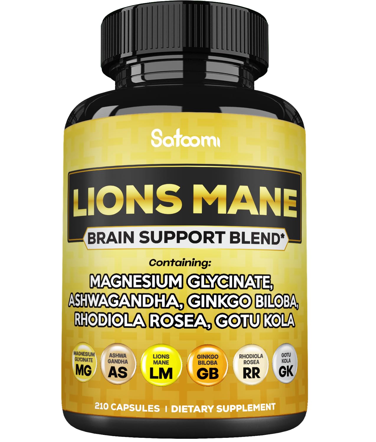 Satoomi Lions Mane Supplement Capsules with Magnesium with Ashwagandha Root, Ginkgo Biloba, Rhodiola Rosea and Gotu Kola - 210 Vegan Capsules - Support Brain Health, Positive Mood & Energy Production 210 Count (Pack of 1)
