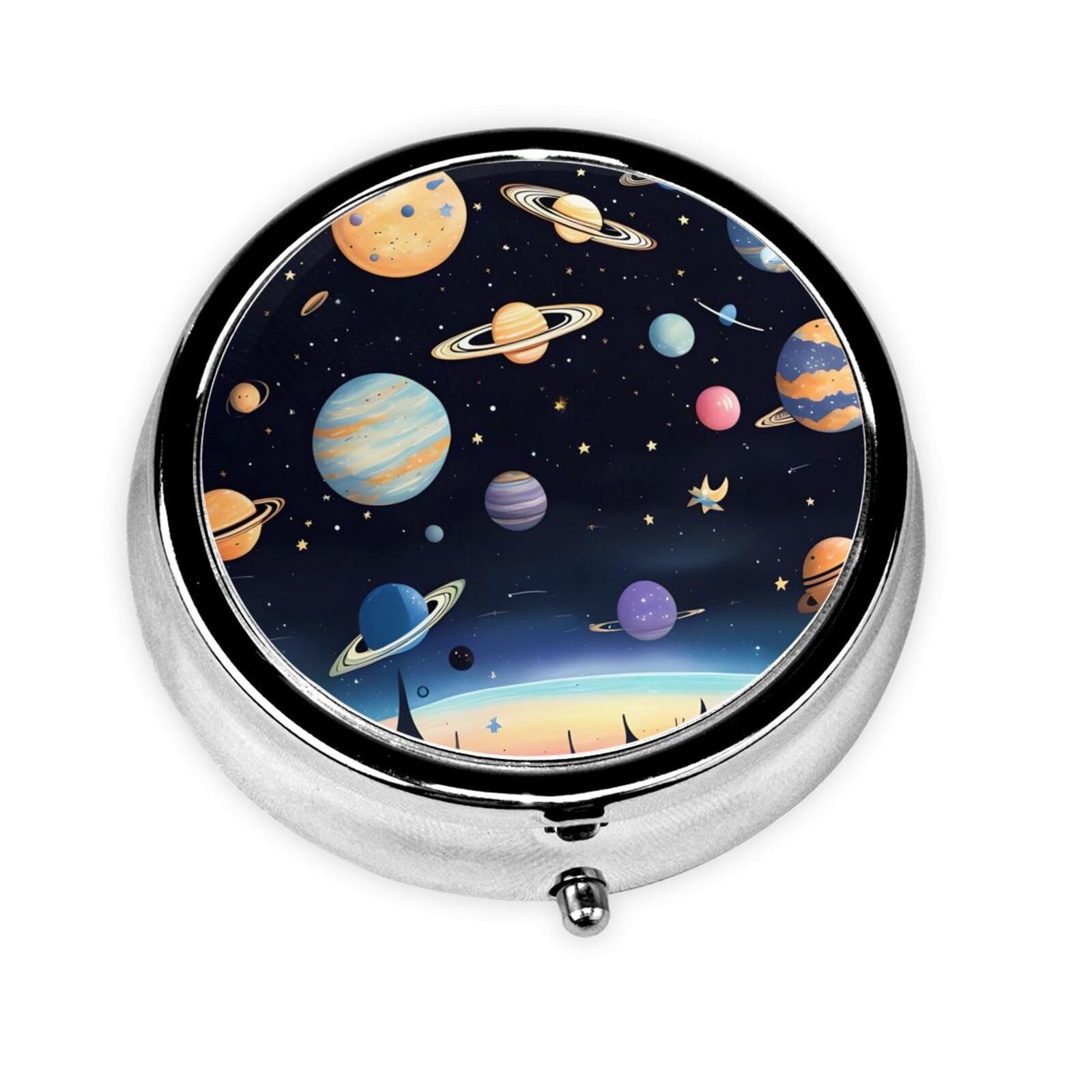 Saturn Jupiter Earth Round Mini Pill Box : Our Pill Box Is Made Of Metal Plated With Iron To Resist Daily Wear And Tear And Prolong Its Life.2.0 X 2.0 X 0.7 Inches (Approx. 4.6 X 4.6 X 1.8 Centimeters), This Round Mini Pill Box Is Compact And Lightweight^, With 3 Plastic Compartments And A Hinged Closure Inside. The Round Mini Pill Box Takes Up Little Space And Can Be Carried In Your Pocket Or Purse, Perfect For Traveling.