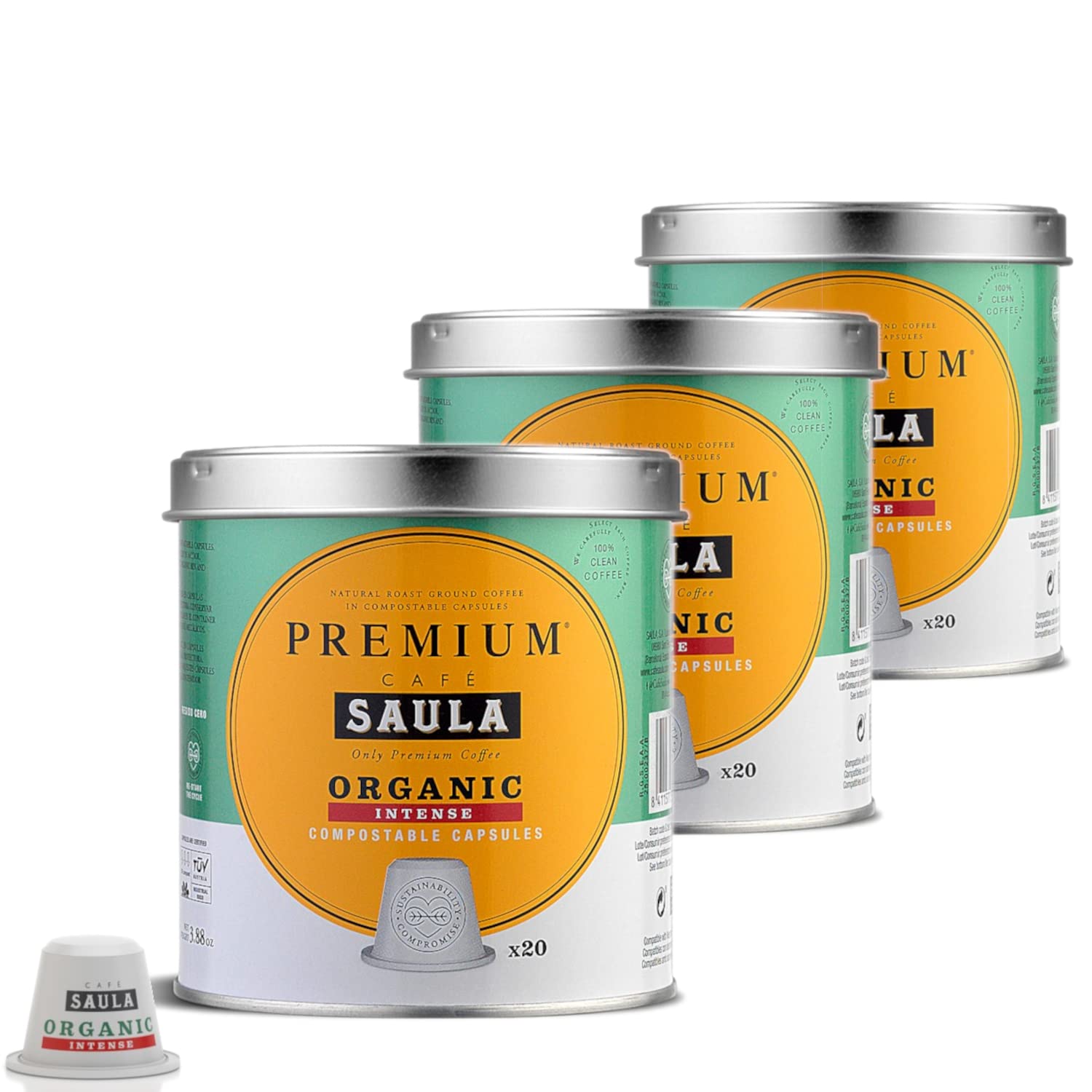 SAULA PREMIUM Saula Coffee Pack of 3 jars of 60 compostable capsules. 100% organic intense coffee. Nespresso compatible.