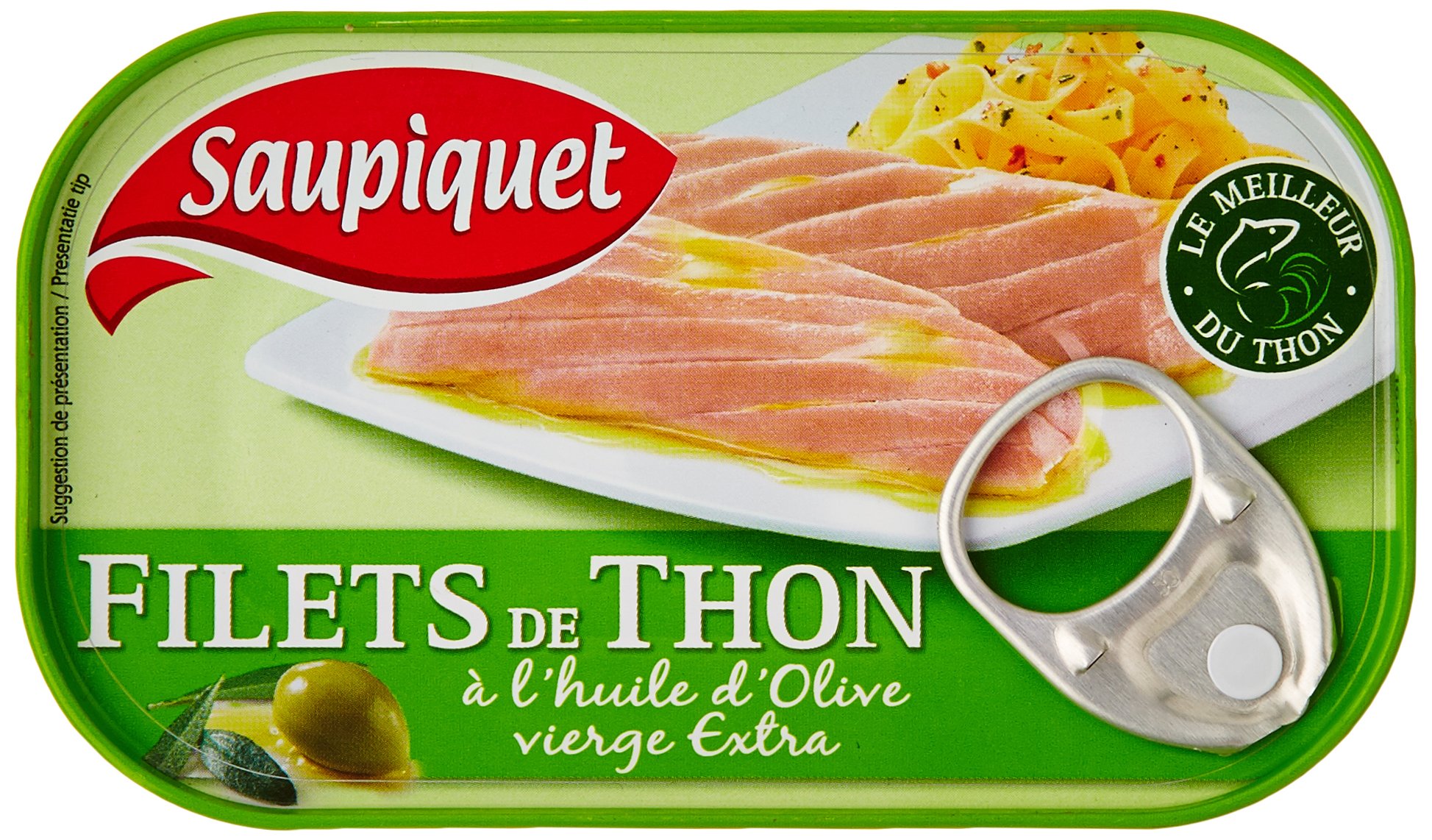 Saupiquet Tuna in Olive Oil 115g CanThe 81g net drained box. Saupiquet de Thon L'Huile D'Olive la Bote 115gLa boîte de 81g net égoutté.