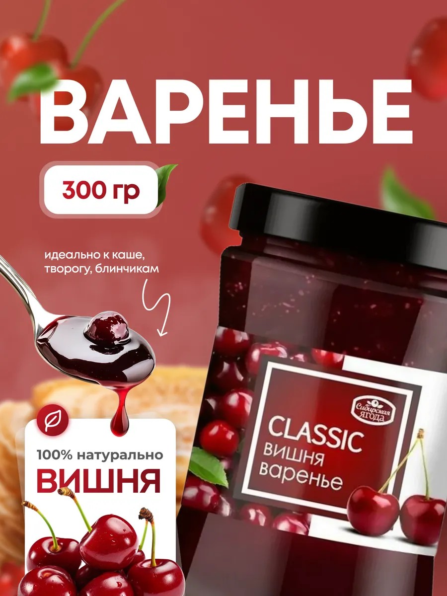 Each jar of jam contains 300 grams of natural product. Thanks to the production technology, the jam preserves all the beneficial properties of the berries, as well as a composition rich in vitamins and microelements. It contains sugar and cherries, which give it a unique taste and aroma.